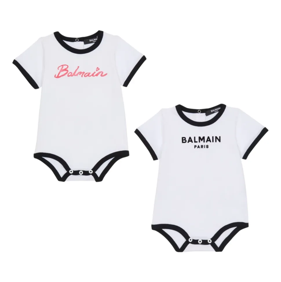2-delige babyset Logo rompertjes Ronde hals Contrasterende Balmain-logo’s aan de voorkant Contrasterende afwerking Drukknoopsluiting Hoofdmateriaal: 100% katoen Gemaakt in Portugal Artikel: BWB51AZ1751