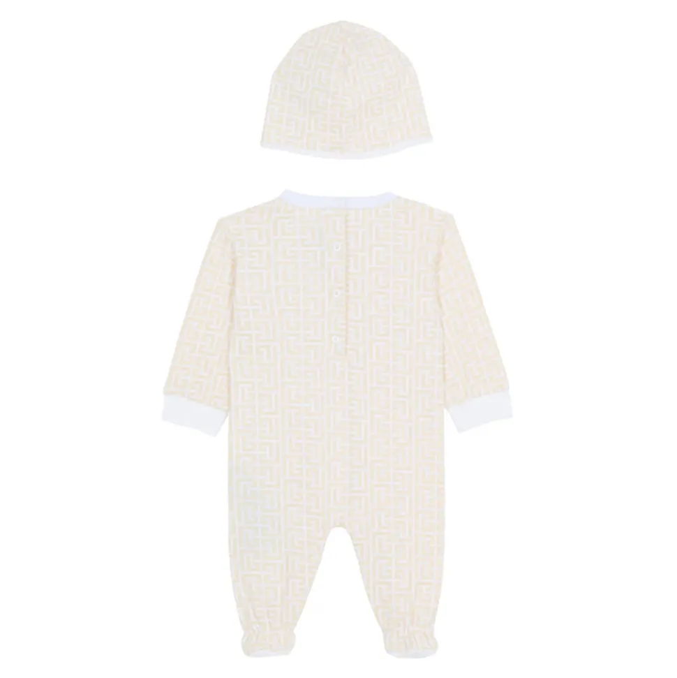 3-delige babyset met PB Labyrinthe-monogram Bijpassende romper, muts en slab Ronde halslijn Drukknoopsluiting Hoofdmateriaal: 100% katoen Gemaakt in Portugal Artikel: BXB51AZ3503