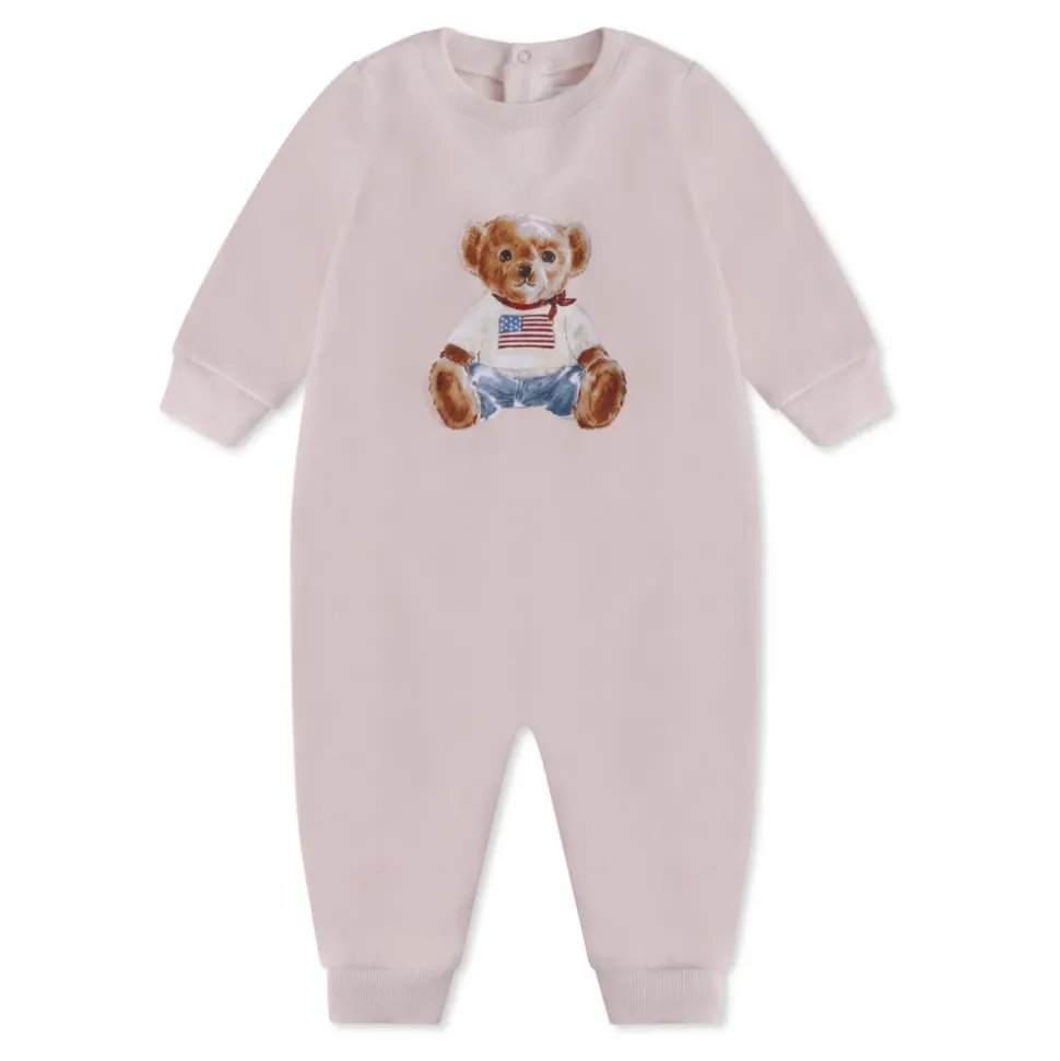 Kleur: RozeBeschrijving: Roze katoenen fleece babypak, met lange mouwen, geribbelde ronde hals, drukknopen op de rug en tussen de benen, geribbelde manchetten en enkels. Het is versierd met Polo Bear aan de voorkant.Details: 60% katoen, 40% polyester. Machinewas op 30°C.