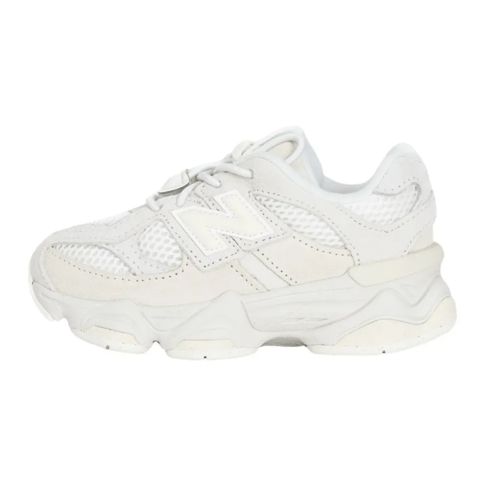 NEW BALANCE Sneakers 9060 in crème voor babyjongens. Pas de kleinste voeten met deze kinderversie van de 9060. Het model 9060 is een nieuwe uitdrukking van verfijnde stijl en innovatief design uit de klassieke 99X-serie. Het herinterpreteert vertrouwde elementen met een visionaire gevoeligheid, geïnspireerd door de zichtbaar technologische en trots futuristische esthetiek van het Y2K-tijdperk. De oscillatiebalken, overgenomen van de 990, zijn uitgebreid en gebruikt over het hele bovenwerk om een gevoel van zichtbare beweging te creëren, terwijl golvende lijnen en geschaalde verhoudingen op de gebeeldhouwde tussenzool de dempingsplatforms van ABZORB en SBS benadrukken. Herfst winter seizoen. Crèmekleurige baby sneakers met lage profiel voor herfst winter IV9060ER.