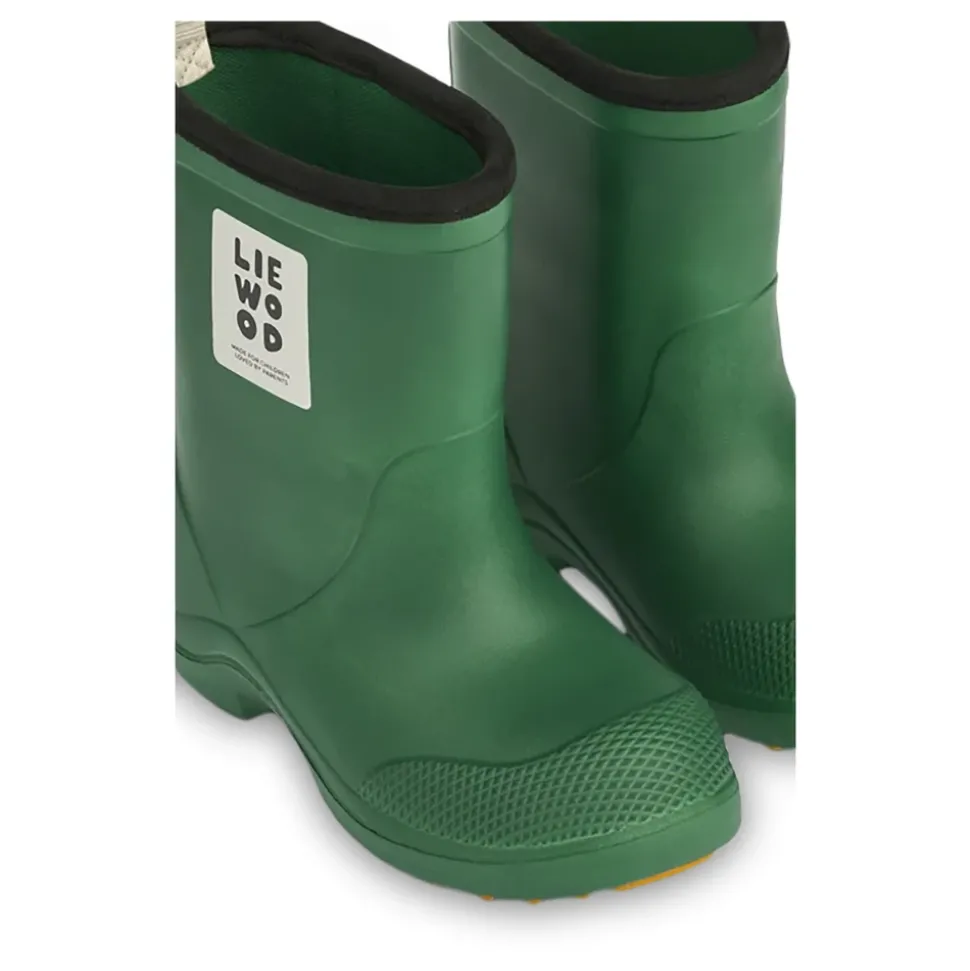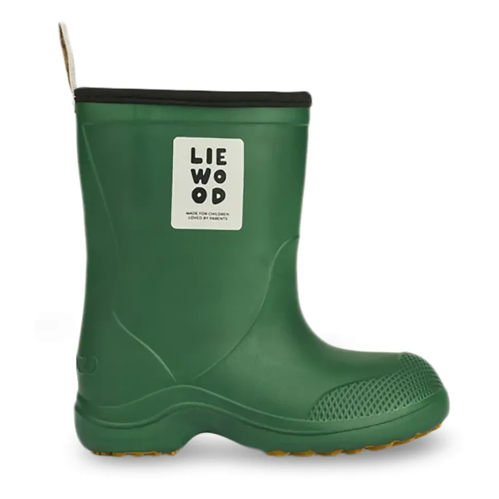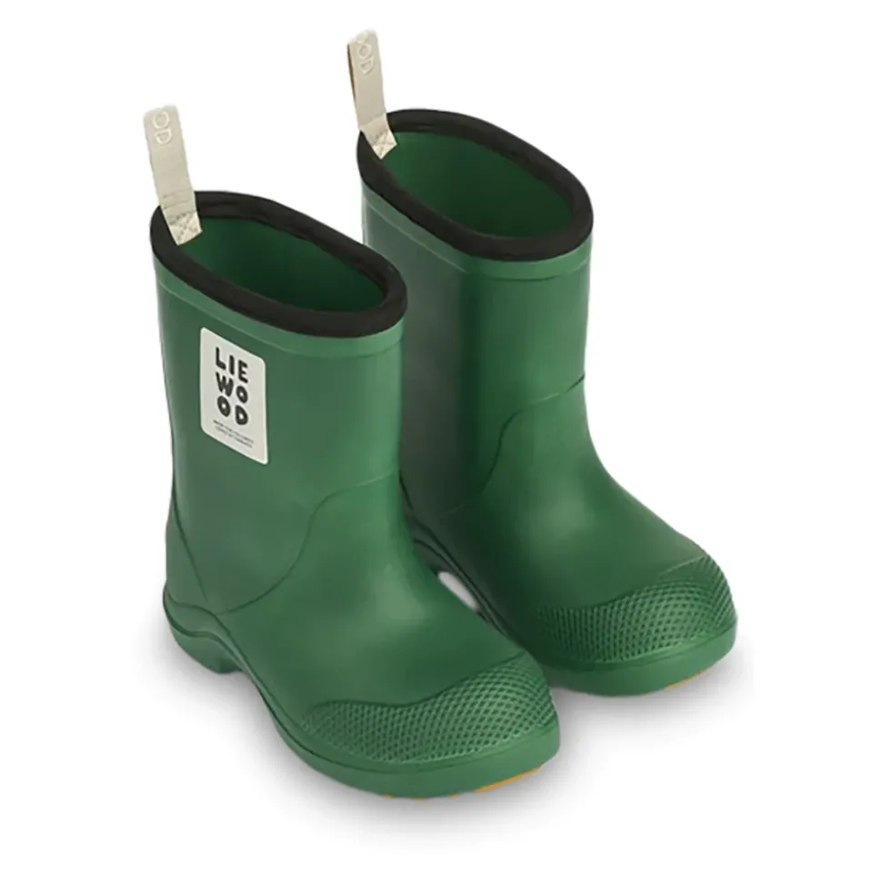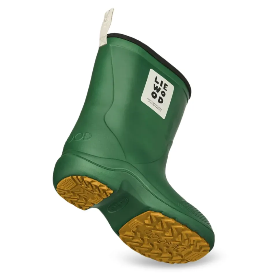 De Liewood Aston regenlaarzen bieden lichtgewicht, waterdichte bescherming met een gripvaste zool voor nat weer. De matte rubberen constructie en de versterkte neus zorgen voor comfort en duurzaamheid bij het spelen in plassen. Belangrijkste kenmerken: Groen | Rubber | 100% waterdicht | Antislip TPR-buitenzool | Lichtgewicht constructie | Lus aan de achterkant om gemakkelijk aan en uit te trekken | Slijtvaste zwarte rand aan de schacht | Reliëf neusversteviging voor extra duurzaamheid | Ronde neus | Matte afwerking | Klassiek silhouet met ronde lijnen | Wit designerlogo op de voorkant | Samenstelling & onderhoud: Afnemen met een vochtige doek en milde zeep. Bewaar uit direct zonlicht.