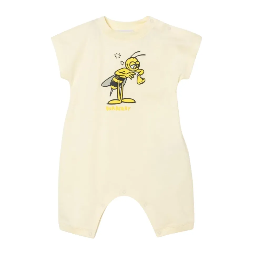 Kleed je kleintje in stijl met deze charmante gele romper van Burberry, ontworpen voor comfort en een chique uitstraling. Belangrijkste kenmerken: Geel | 100% Katoen | Iconisch Burberry-design | Samenstelling en onderhoud: 100% Katoen | Machinewas koud, droogtrommel laag.