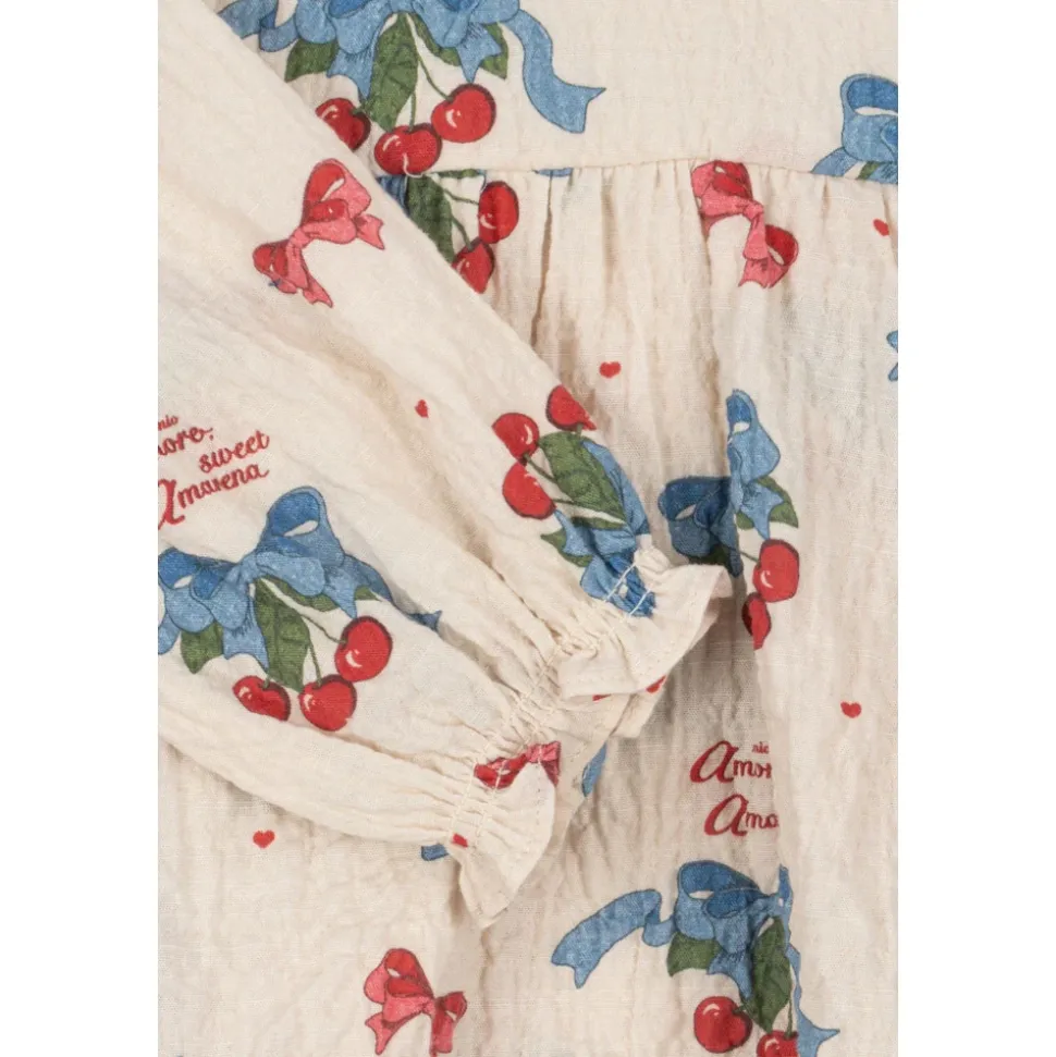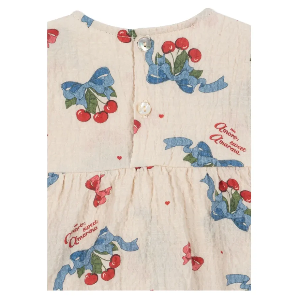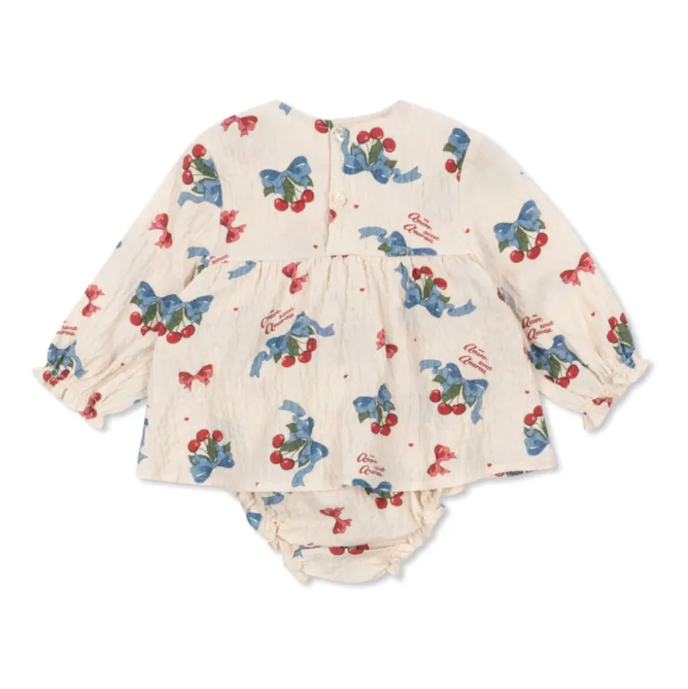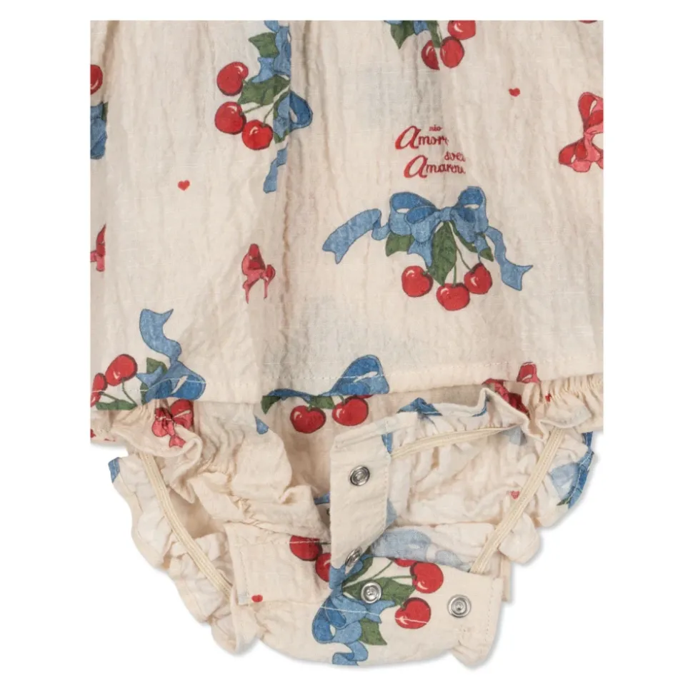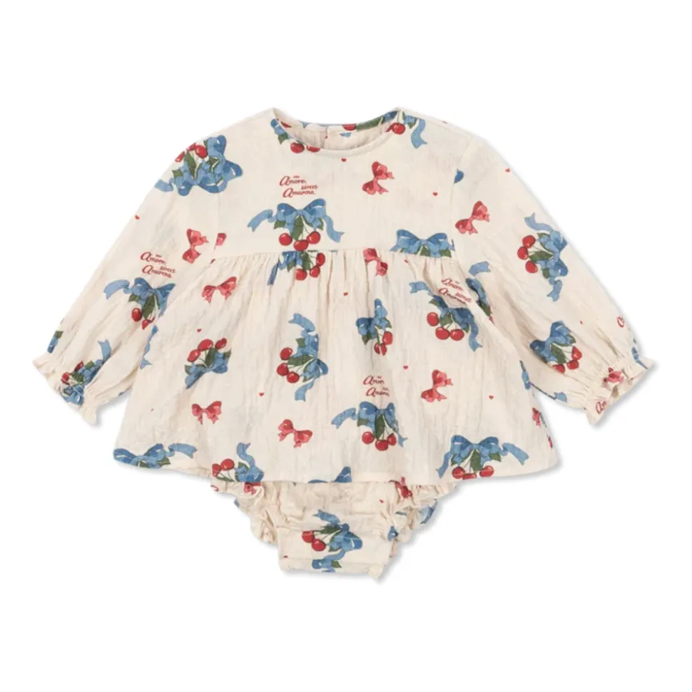 BABY ROMPERTJE van het gerenommeerde merk KONGES SLØJD combineert subtiele elegantie en functionaliteit. Het innovatieve ontwerp heeft lange mouwen en een uitlopende, uitlopende top geïnspireerd op jurksilhouetten, waardoor het geheel een uniek charmant karakter krijgt. Het onderste deel is bevestigd met praktische drukknopen, wat zorgt voor gemak tijdens dagelijkse luierwisselingen. De delicate, gerimpelde stof van oorsprong zorgt voor de gevoelige huid van uw kind, terwijl de print met rode kersen, blauwe strikken en kleine hartjes de verfijnde esthetiek van het model benadrukt. De opvallende, herhaalde inscriptie