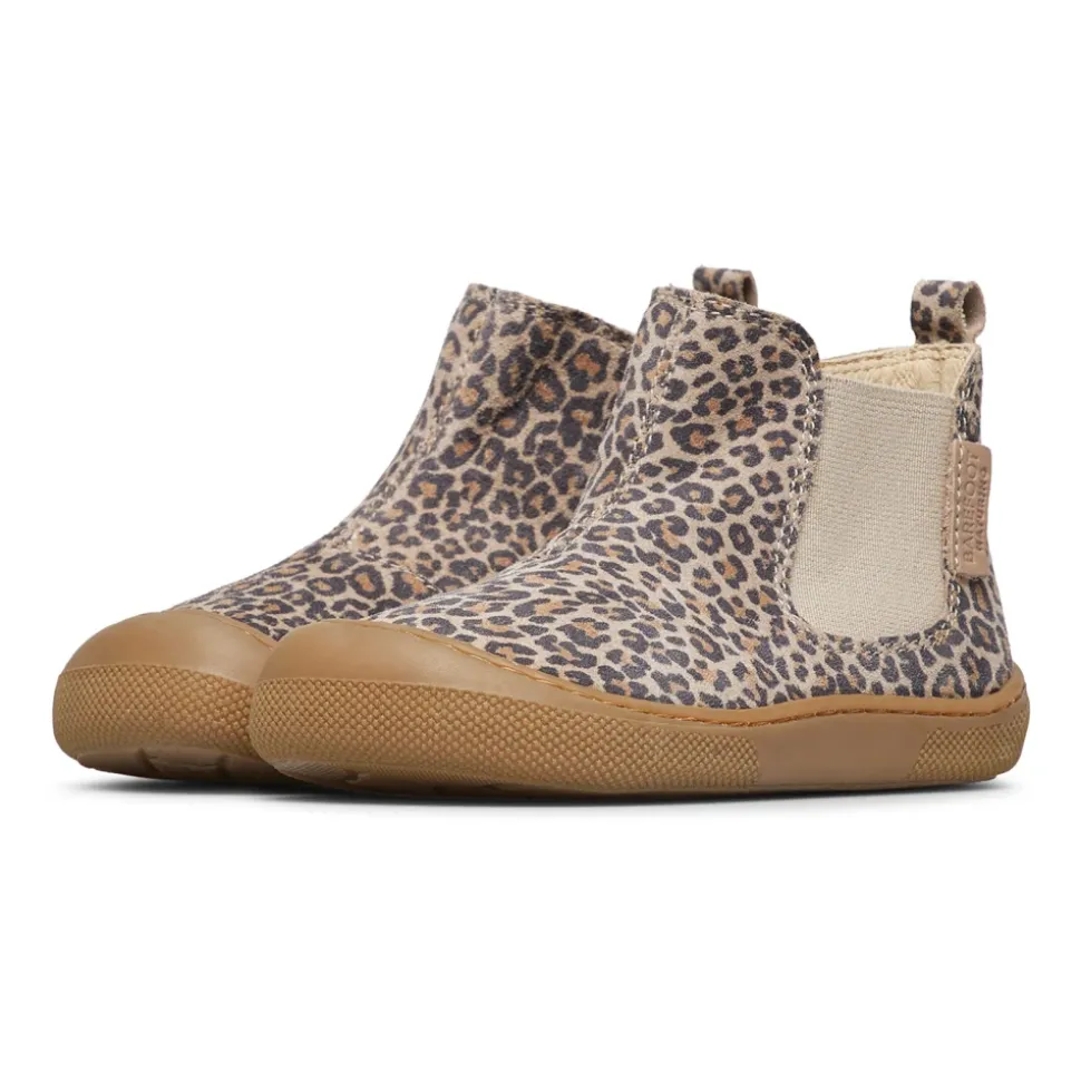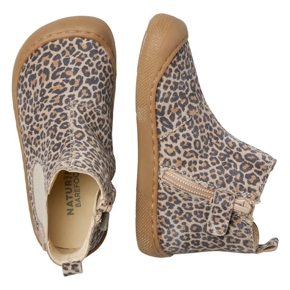 Chelsea line barefoot ankle boots with soft suede upper decorated with leopard print. The model is completed with elastic inserts at the ankle, leather lining and insole, rubber bottom with reinforced toe.