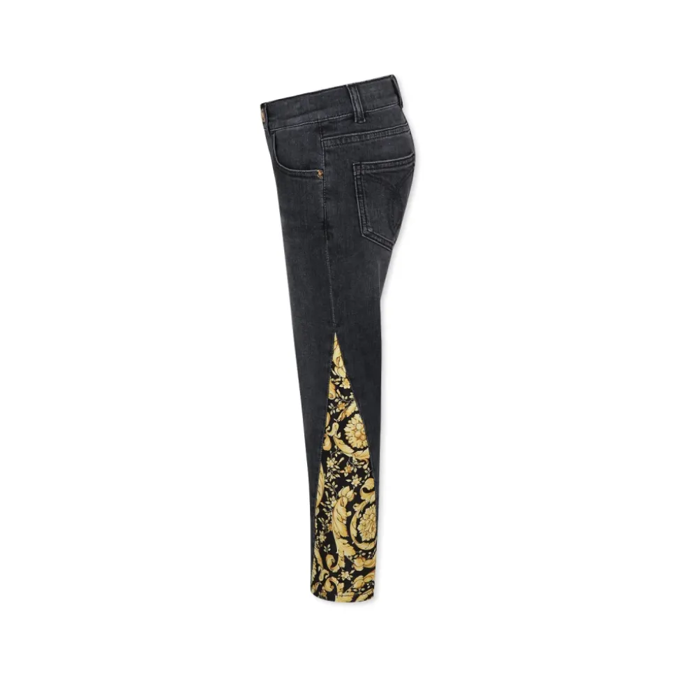 Geef de garderobe van je kind een luxe upgrade met Versace`s Barocco Jeans, met iconische Barok print zijbanden en Medusa details. Belangrijkste kenmerken: Zwart | Katoen | Verstelbare taille met intern elastiek en knopen | Ritssluiting en knoop aan de voorkant | Five-pocket model | Riemlussen | Barok print zijbanden | Medusa details | Afmetingen en pasvorm: Regular fit | Samenstelling en onderhoud: 99% katoen | 1% elastaan | Machinewas op 30°C