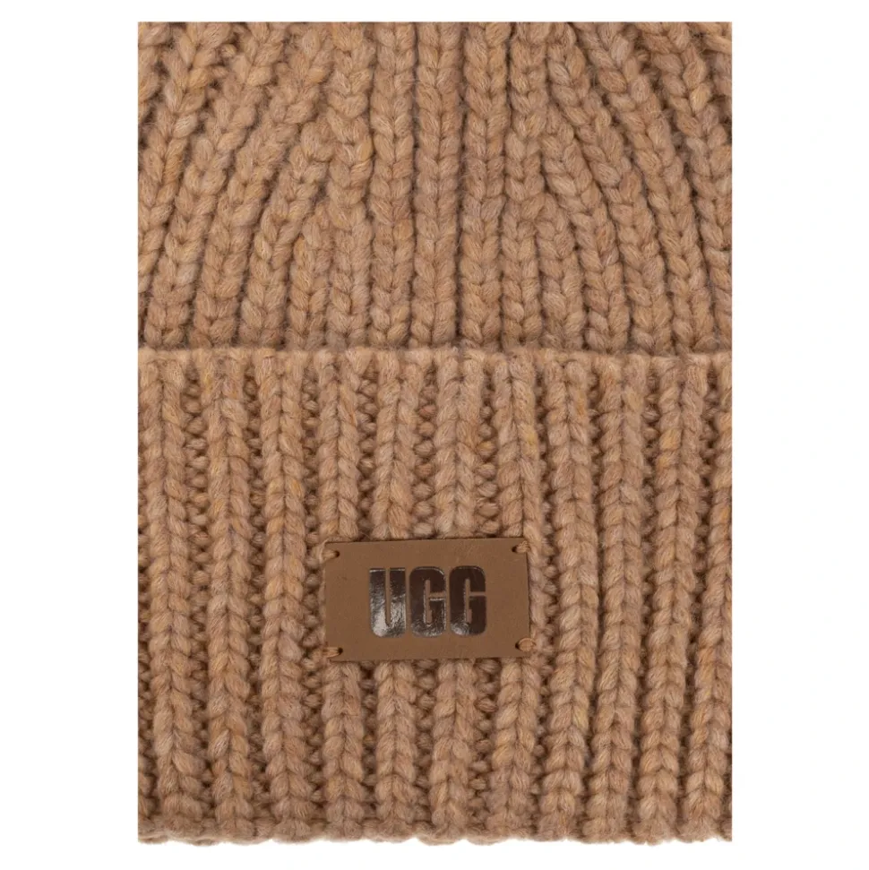 Blijf warm en stijlvol met deze beige UGG muts met logo patch. Gemaakt van een stofmix met een geribbeld breisel, is deze muts perfect om een vleugje merkherkenning toe te voegen aan je wintergarderobe.