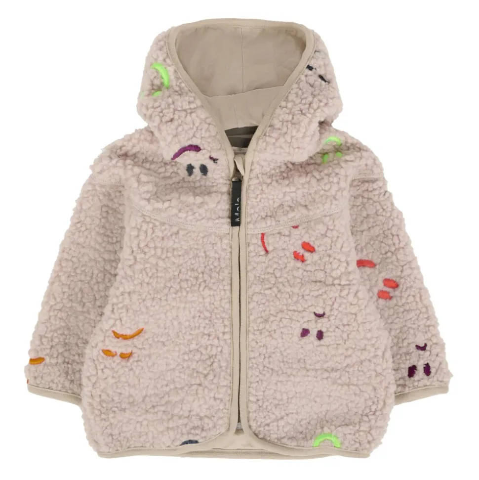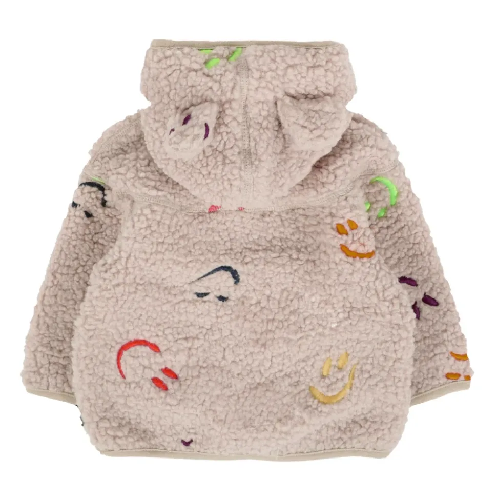 Blijf warm en stijlvol deze winter met de Molo beige faux shearling jas voor kinderen. Deze gezellige jas heeft lange mouwen, een capuchon met schattige aangehechte oren en een ritssluiting aan de voorkant. Versierd met veelkleurig smiley borduursel overal, is het een leuk en modieus keuze voor het seizoen. Gemaakt van 100% polyester. Machinewas op 30°C.