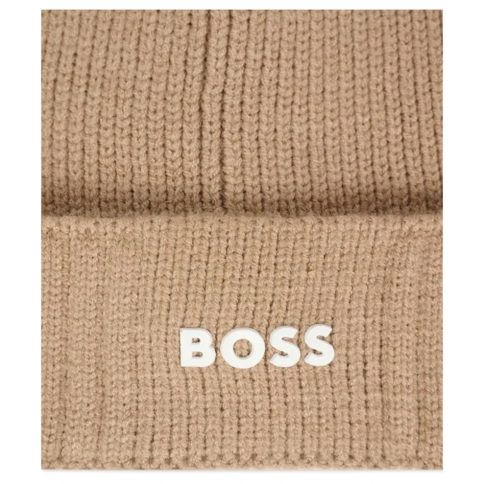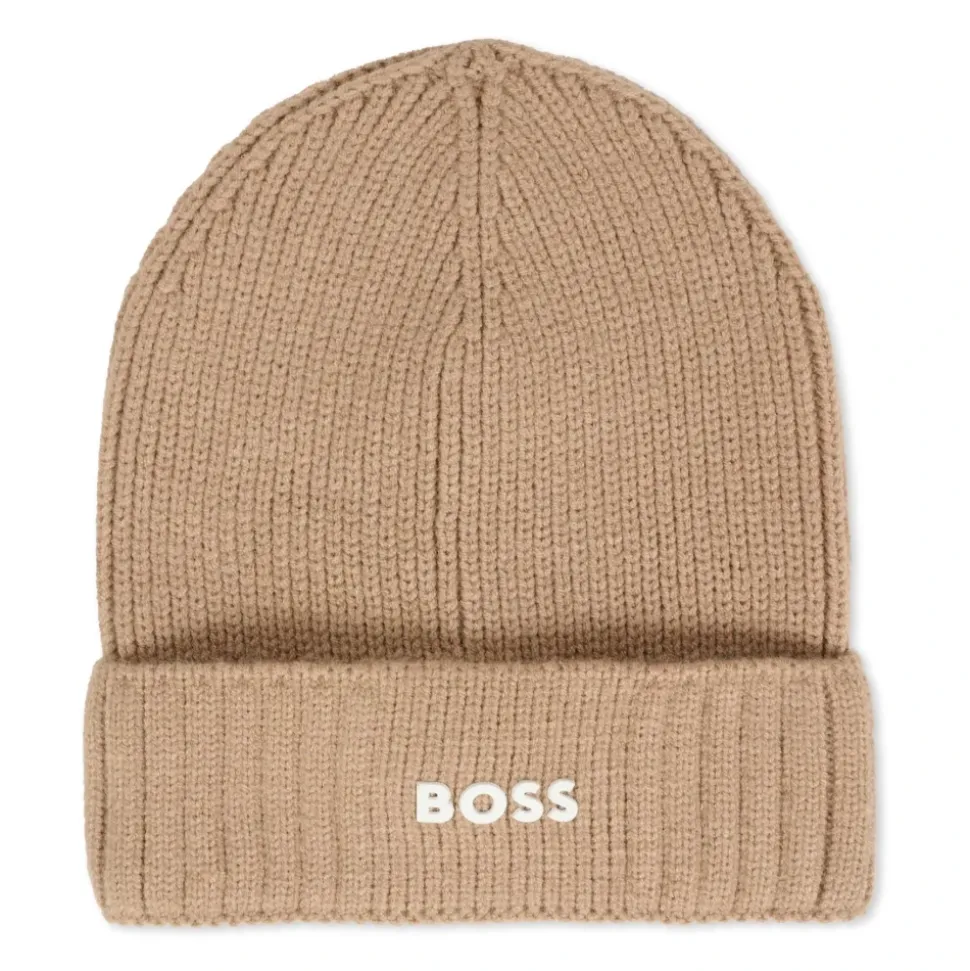 Voeg een stijlvolle touch toe aan de outfit van je kind met deze beige gebreide muts van Hugo. Met een omslag en een wit rubberen logo aan de voorkant, is deze muts gemaakt van een mix van viscose, polyester, acryl en polyamide. Makkelijk te onderhouden, gewoon wassen in de machine op 30°C.