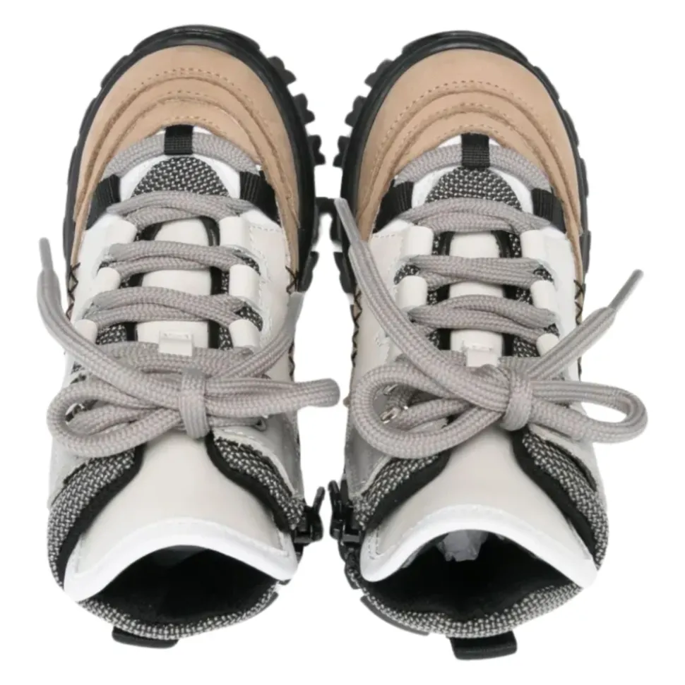 Dsquared2 Kids beige/grijze leren enkellaarzen met color-block design, vetersluiting aan de voorkant, zijritssluiting, hiel lip, esdoornblad detail, zijlogo print, decoratieve stiksels, ronde neus, logo-print binnenzool, rubberen profielzool, enkellengte. Buitenkant: 100% leer, 100% kalfsleer Voering: 100% stof, 100% kalfsleer. Gemaakt in Italië Zool: 100% rubber.