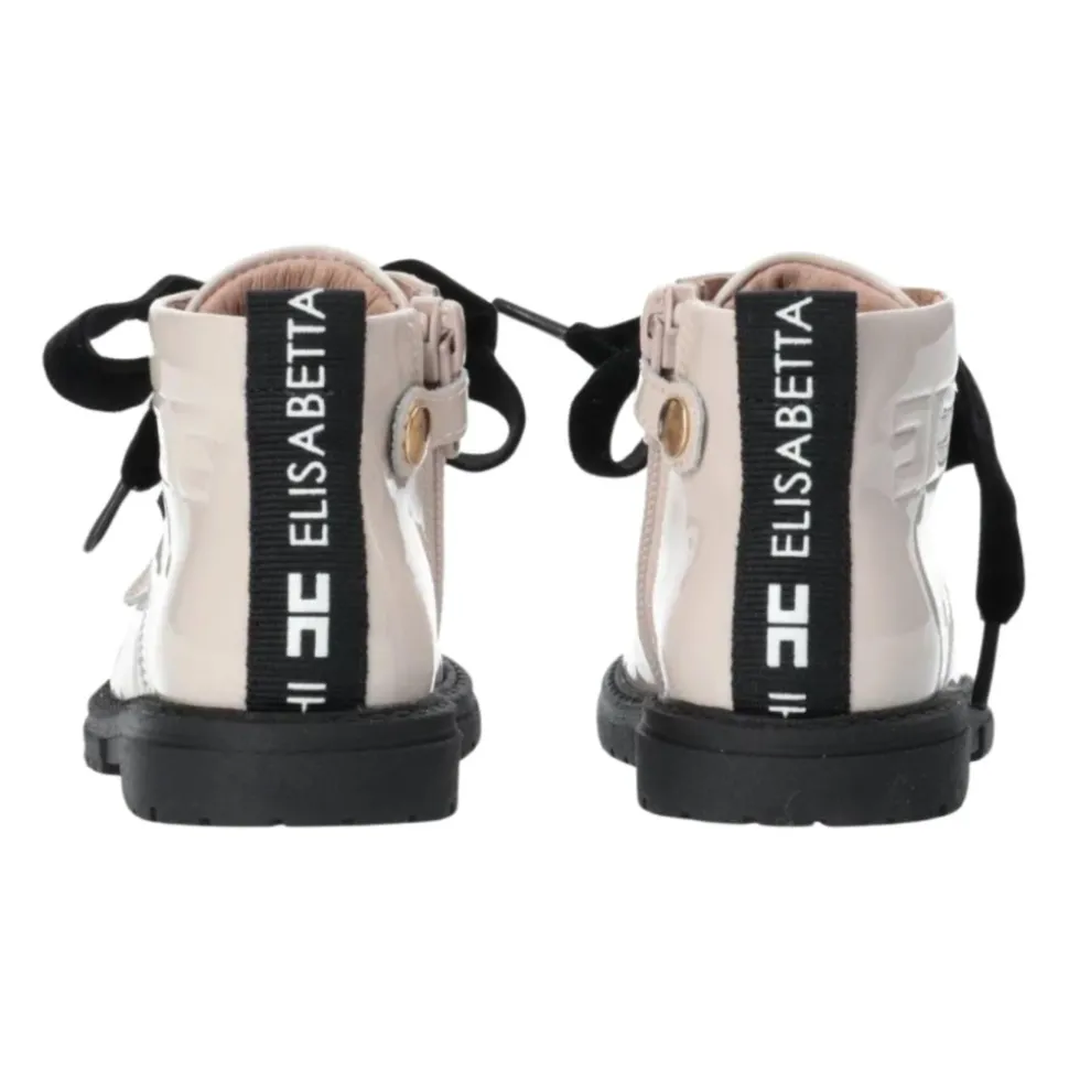 Ontdek de elegantie van Elisabetta Franchi`s Beige Kinder Enkellaarsjes, vervaardigd in Italië met glanzend lakleer voor een stijlvolle look. Belangrijkste kenmerken: Beige | Lakleer | Zijrits sluiting | Drukknoopsluiting | Veters met fluweel effect | Hieltab met logo | Ronde neus | Samenstelling en onderhoud: Leren binnenzool | Rubberen profielzool