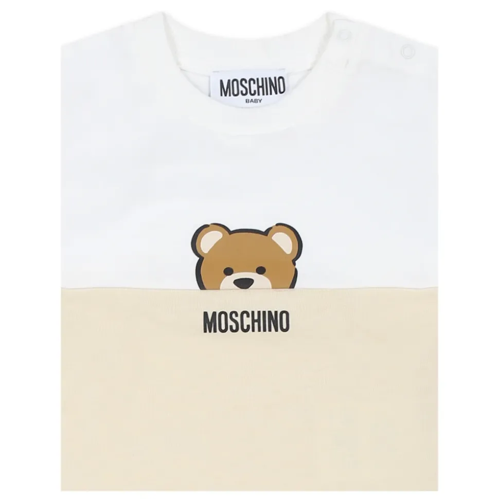 Kleed je kleintje in stijl met dit beige pak van Moschino Kids. Gemaakt van 100% katoen, deze set bevat een korte mouwen t-shirt met een ronde hals en drukknoopsluiting, versierd met Teddy Bear en logo details aan de voorkant. De shorts hebben een elastische taille, zijzakken en een achterzak, ook versierd met Teddy Bear en logo details. Machinewasbaar op 30°C.