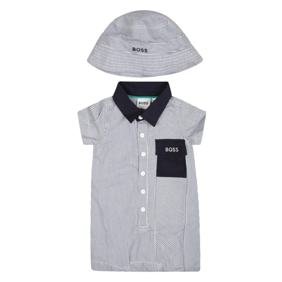 Kleed je kleintje in stijl met deze Hugo blauwe katoenen romper en hoed set. De romper heeft korte mouwen, een puntkraag, drukknoopsluiting en een schattige zak met het logo van het merk. Zowel de romper als de hoed zijn versierd met blauwe en witte strepen voor een charmante uitstraling. Gemaakt van 100% katoen. Machinewasbaar op 30°.