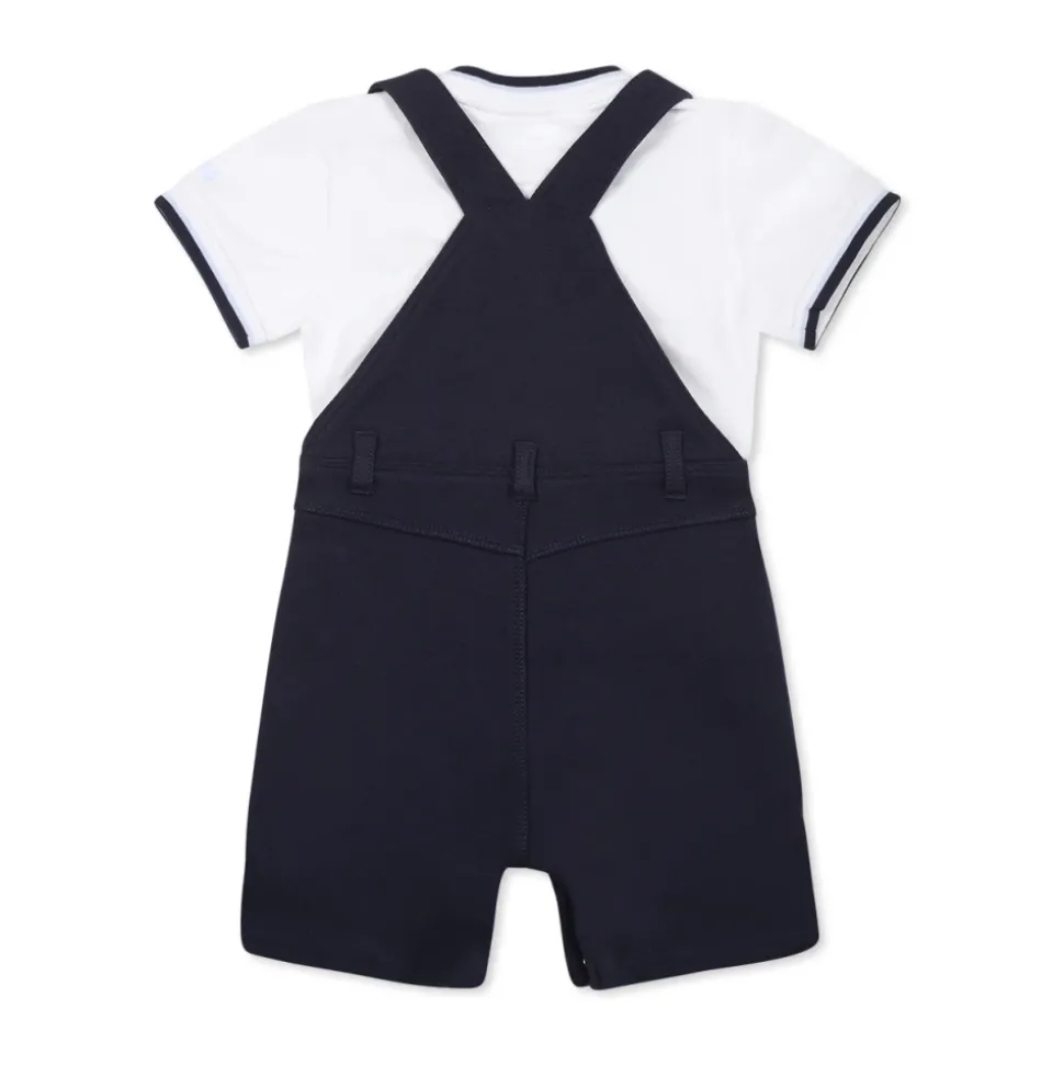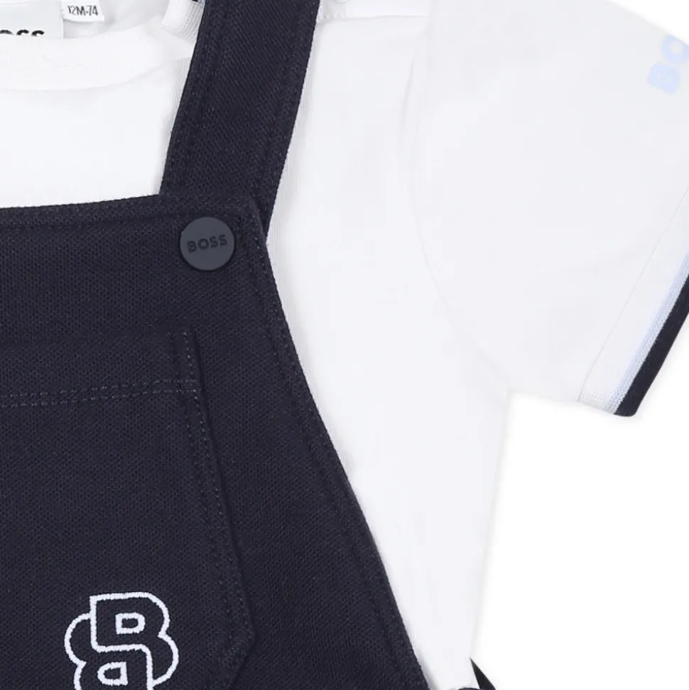 Kleed je kleintje in stijl met deze Hugo blauwe jumpsuit. De set bevat een wit t-shirt met een logodetail op de mouw en blauwe tuinbroek met verstelbare bretels en meerdere zakken. Gemaakt van 95% katoen en 5% elastaan. Machinewasbaar op 30°C.