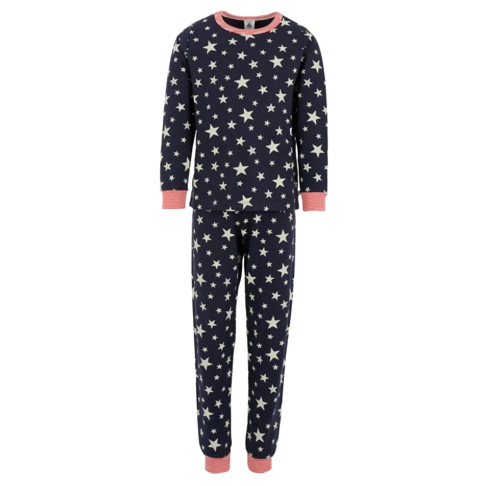 Kleed je kleintje in stijl en comfort met deze Petit Bateau blauwe katoenen fleece pyjama’s. De set bestaat uit een shirt met lange mouwen met een rood-wit gestreepte hals en manchetten, en een broek met een elastische taille en bijpassende gestreepte enkels. Versierd met een allover sterrenprint die oplicht in het donker, zijn deze pyjama’s perfect voor een sprankelende nachtrust. Gemaakt van 100% katoen. Machinewasbaar op 30°C.