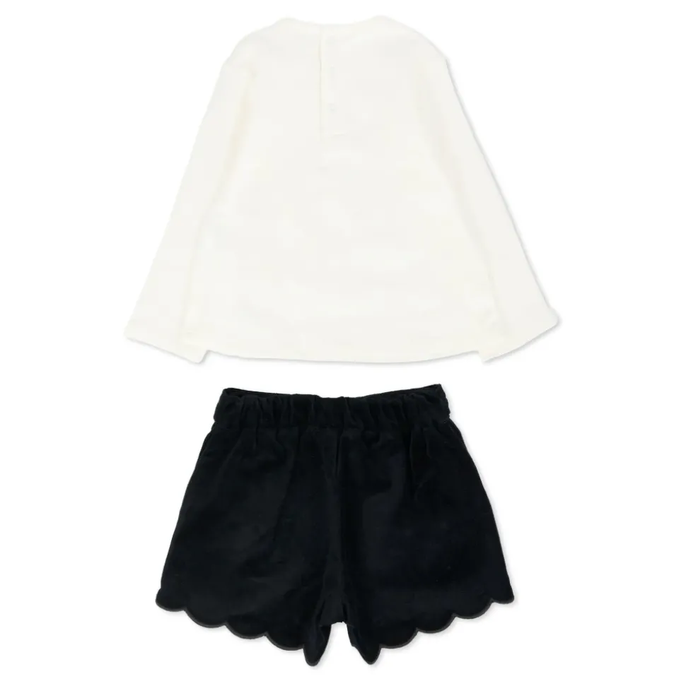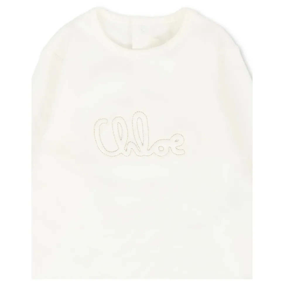 Chloé Kids Blauw T-shirt en Shorts Set voor meisjes. Deze set bevat een ivoorkleurige longsleeve T-shirt met ronde hals en drukknoopsluiting, met een geborduurd logo op de voorkant. Gecombineerd met blauwe fluwelen shorts met elastische achterkant, zijzakken, gouden knopen in de taille en geschulpte zoom. Gemaakt van 100% katoen. Machinewas op 30°C.