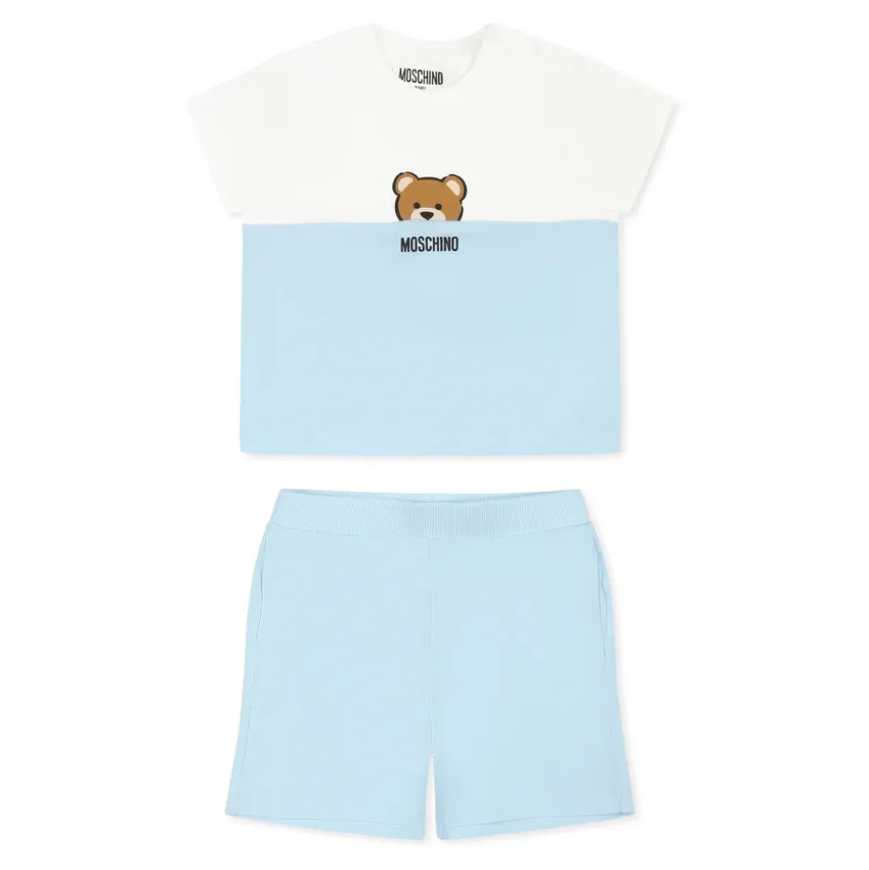 Kleed je kleintje in stijl met dit lichtblauwe pak van het merk Moschino Kids. Gemaakt van 100% katoen, deze set bestaat uit een korte mouwen t-shirt met een ronde hals en drukknoopsluiting, versierd met Teddy Bear en logo details aan de voorkant. De shorts hebben een elastische taille, zijzakken en een achterzak, ook versierd met Teddy Bear en logo details. Machinewasbaar op 30°C.