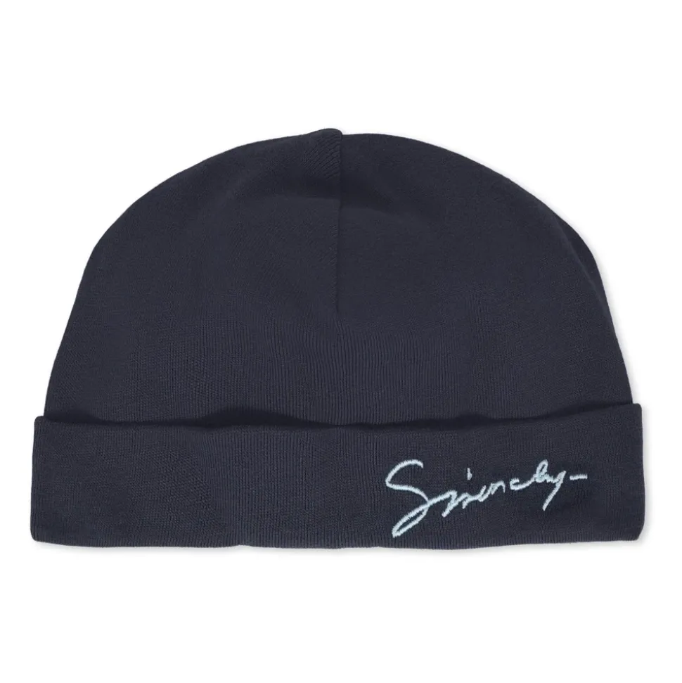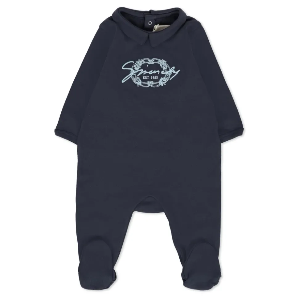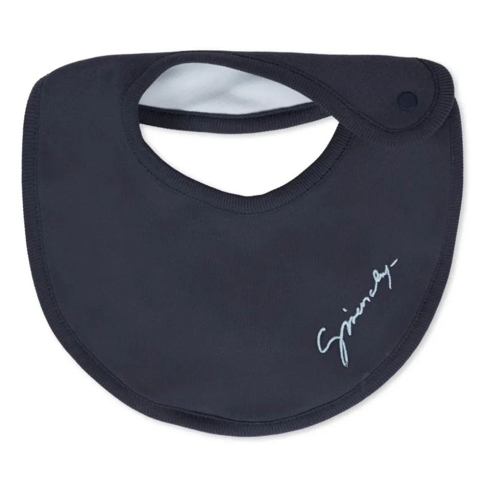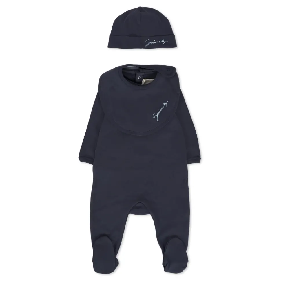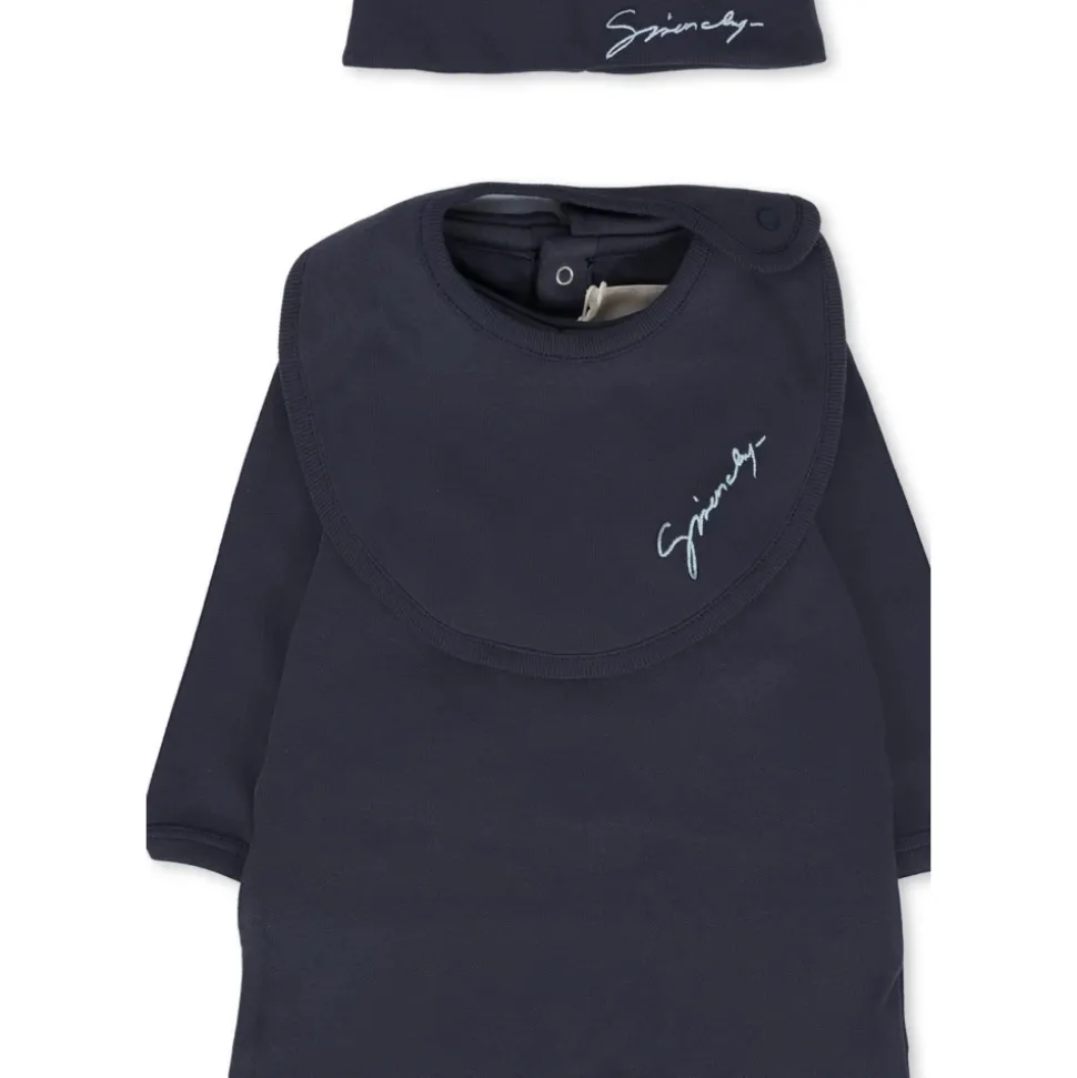 Kleed je kleintje in stijl met deze blauwe babygrow set van het luxe merk Givenchy Kids. Deze set bevat een babygrow, muts en slab, allemaal gemaakt van 100% katoen. De babygrow heeft een puntkraag, drukknoopsluiting op de rug en voetjes, terwijl de muts omgeslagen is voor extra schattigheid. De slab maakt de set compleet met een drukknoopsluiting aan de zijkant en een logo op de voorkant. Machinewasbaar op 30°C.