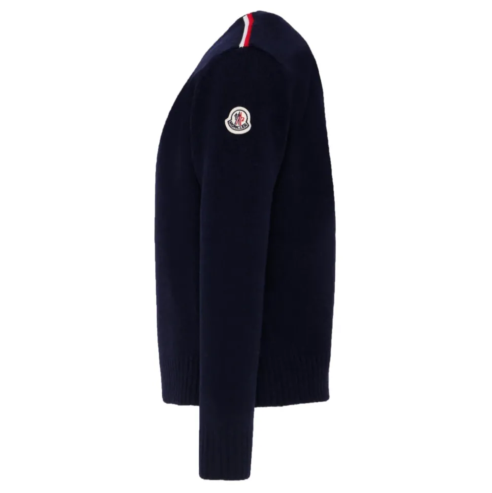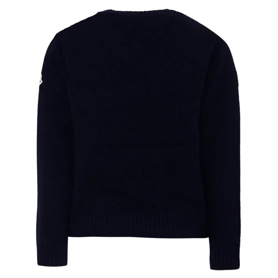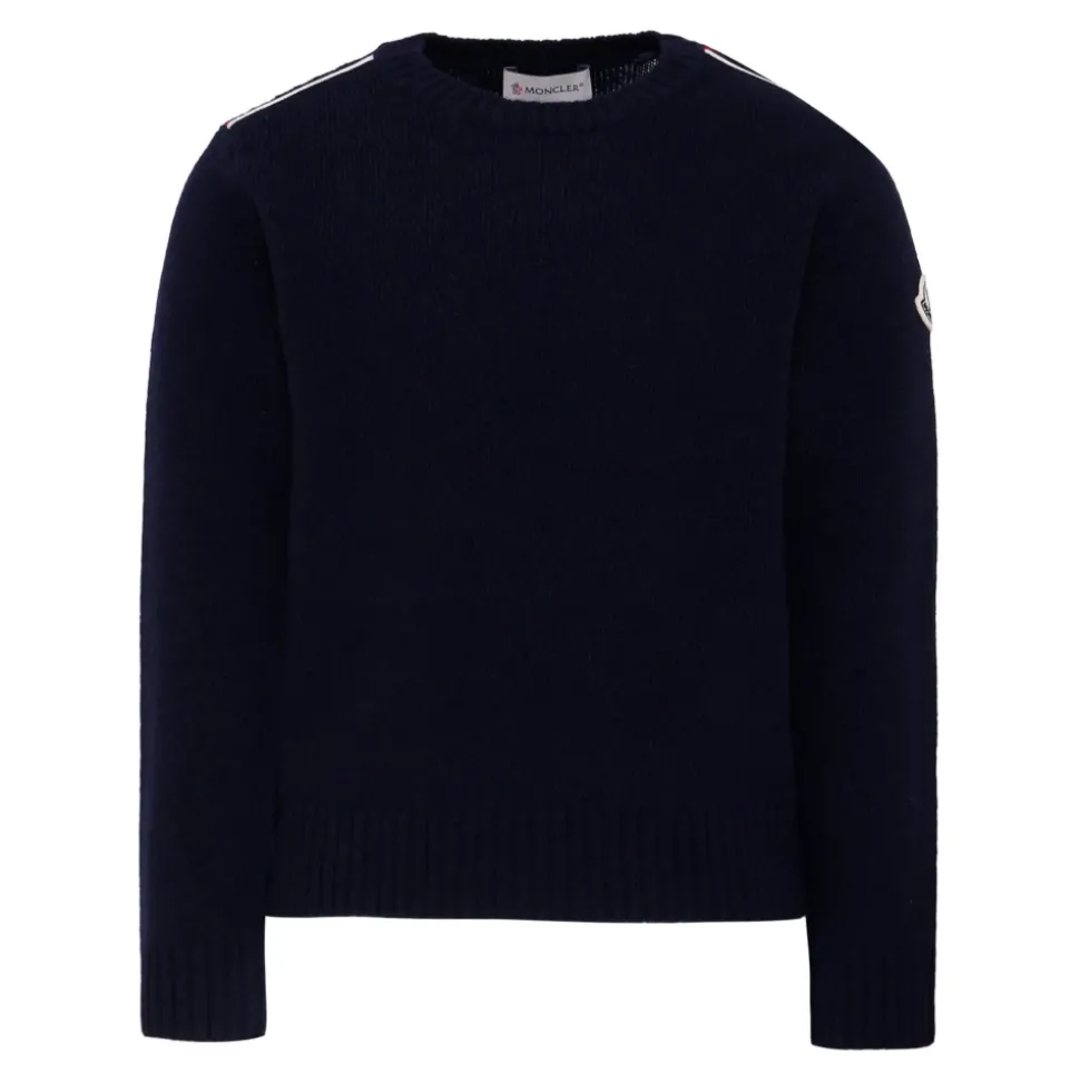 Upgrade de stijl van je kind met deze Moncler blauwe trui met lange mouwen. Gemaakt in Italië van 100% wol, met een ronde hals, geribbelde manchetten en zoom, en rood, wit en blauw gestreept detail op de schouders. Compleet met een iconisch logopatch op de mouw. Alleen handwas.