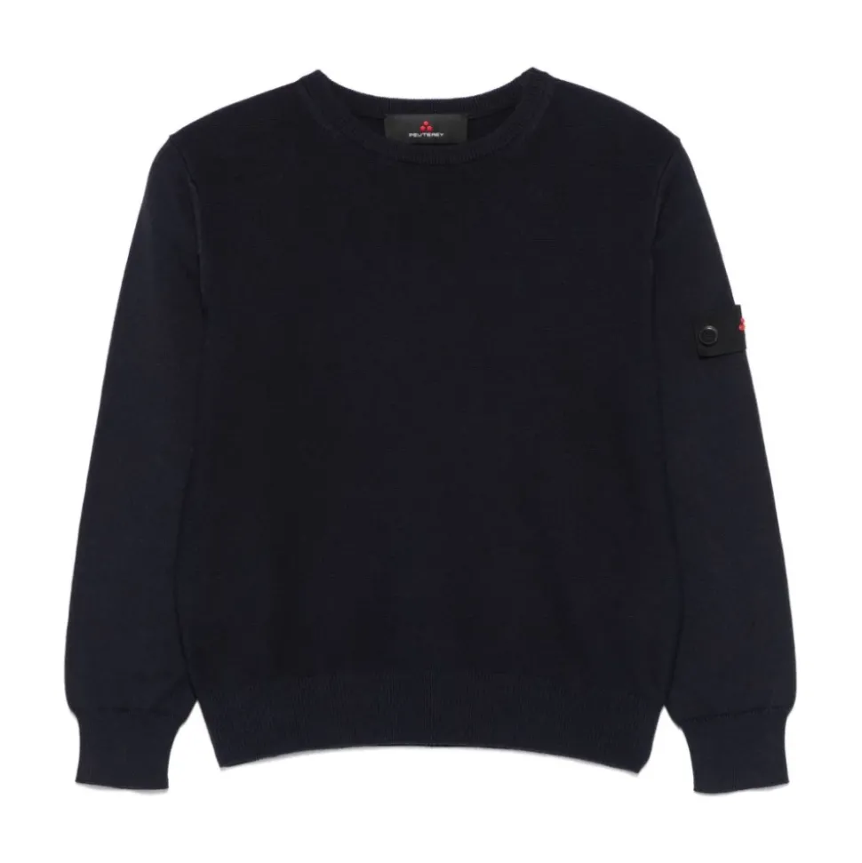 Peuterey navy blue crew neck gebreid voor jongens met lange mouwen, geribbelde afwerking en logopatch op de mouw.
