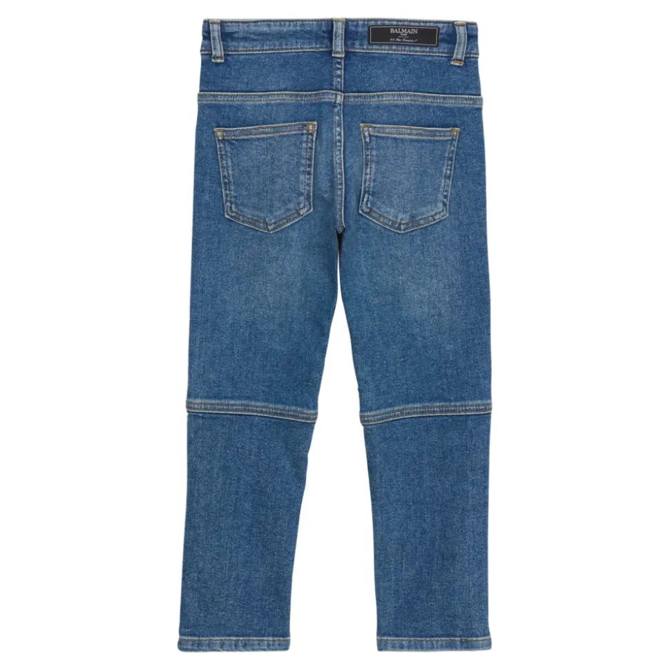 Blauwe denim biker jeans Tailleband met riemlussen Vlieg Rits- en drukknoopsluiting onder een overslag 5 klassieke zakken 2 zichtbare ritssluitingzakken, Balmain Paris-gegraveerde slider Geribbelde knieën Regular fit Hoofdmateriaal: 99% katoen 1% elastaan Gemaakt in Turkije Artikel: BW6R90Z2363