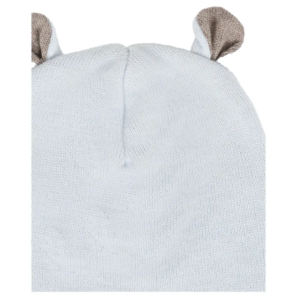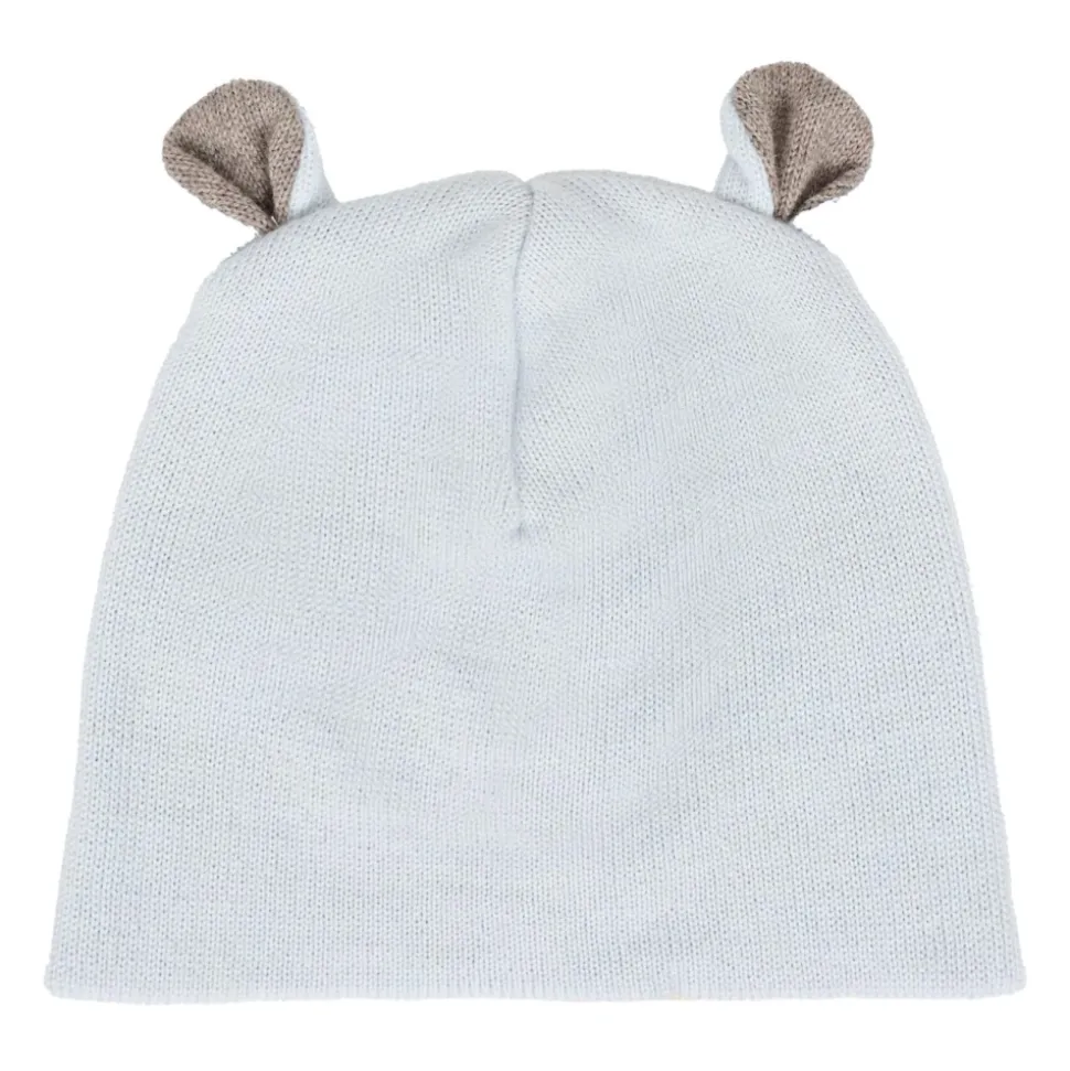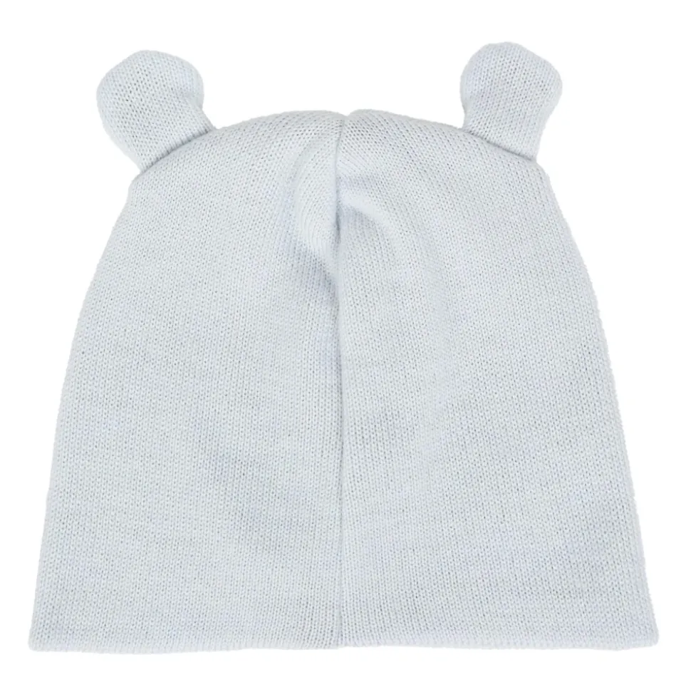 Voeg een vleugje speelsheid toe aan de outfit van je kleintje met deze Little Bear lichtblauwe gebreide wollen muts. Voorzien van schattige duifgrijze oren aan de bovenkant, gemaakt in Italië van 100% wol. Alleen handwas.