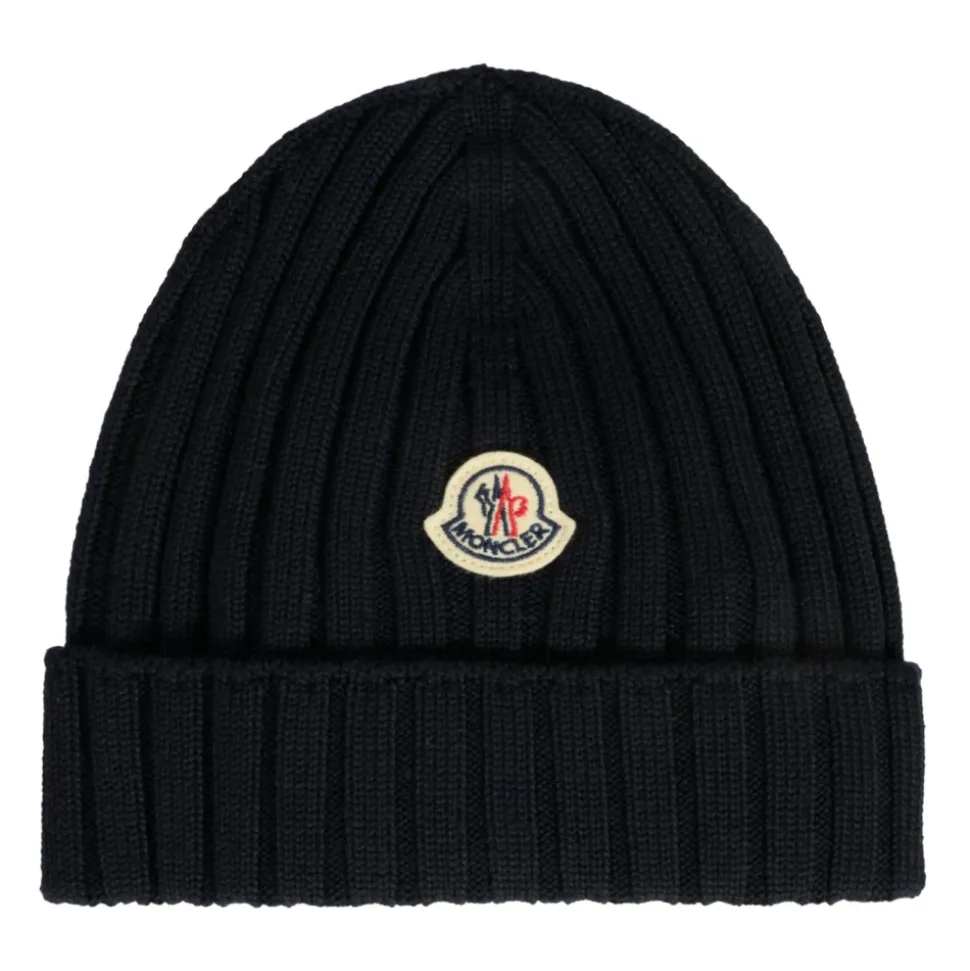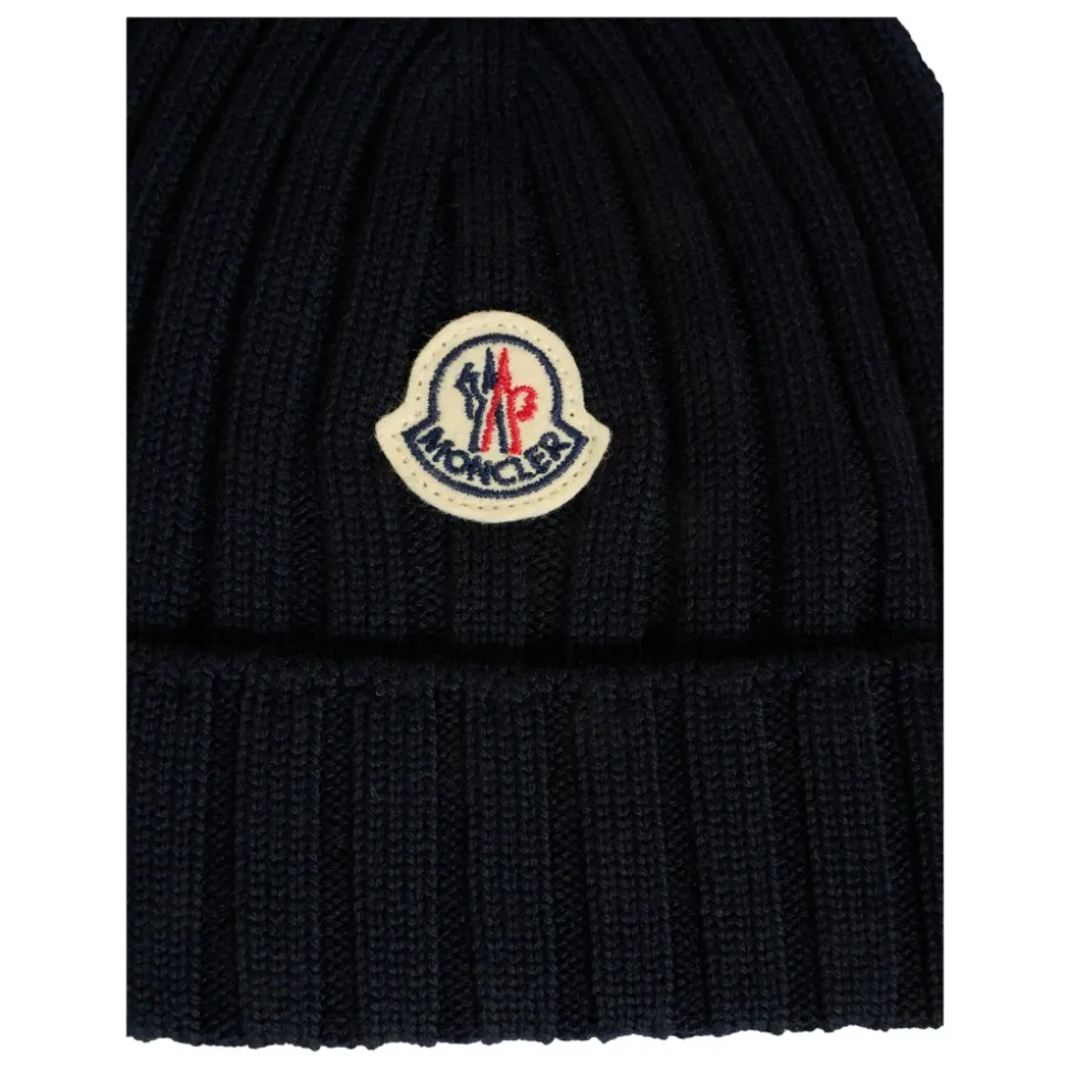 Upgrade de stijl van je kind met deze Moncler blauwe geribbelde wollen muts, met omslag en iconisch logopatch. Gemaakt in Italië van 100% wol. Alleen met de hand wassen.