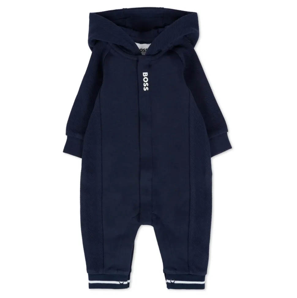 Kleed je kleintje in stijl met deze Hugo blauwe babygrow. Voorzien van een capuchon, drukknoopsluitingen, geribbelde manchetten en enkels, en een wit logo op de voorkant. Gemaakt van 84% katoen, 14% polyester, 2% elastaan. Machinewas op 30°C.