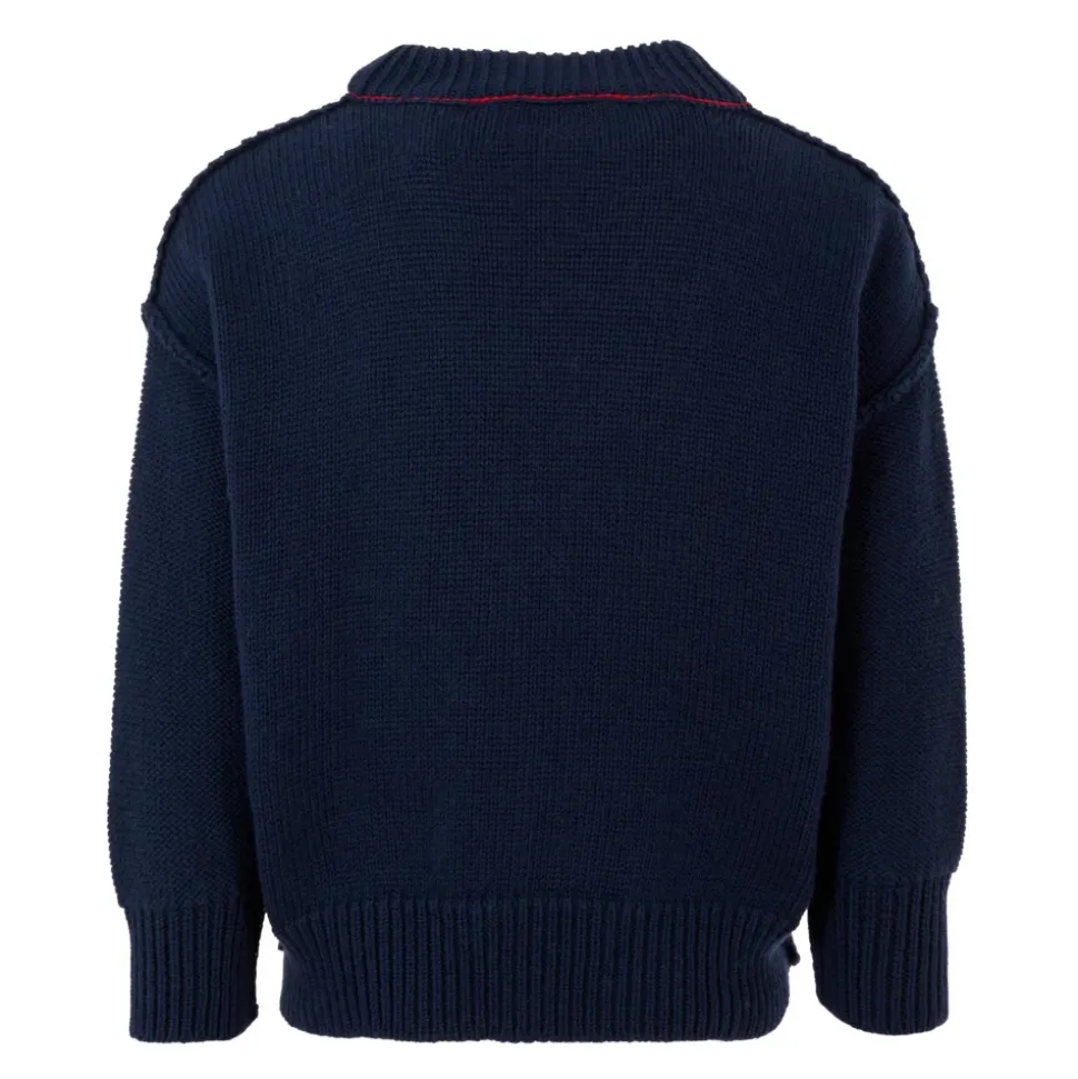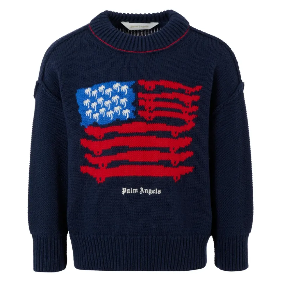 Upgrade de garderobe van je kind met deze blauwe katoen- en wolmix trui van Palm Angels. Met lange mouwen, geribbelde ronde hals, manchetten en zoom. Versierd met een geborduurd logo en jacquard Amerikaanse vlag ontwerp op de voorkant, met palmbomen en surfplank. Gemaakt van 85% katoen en 15% wol. Alleen handwas.