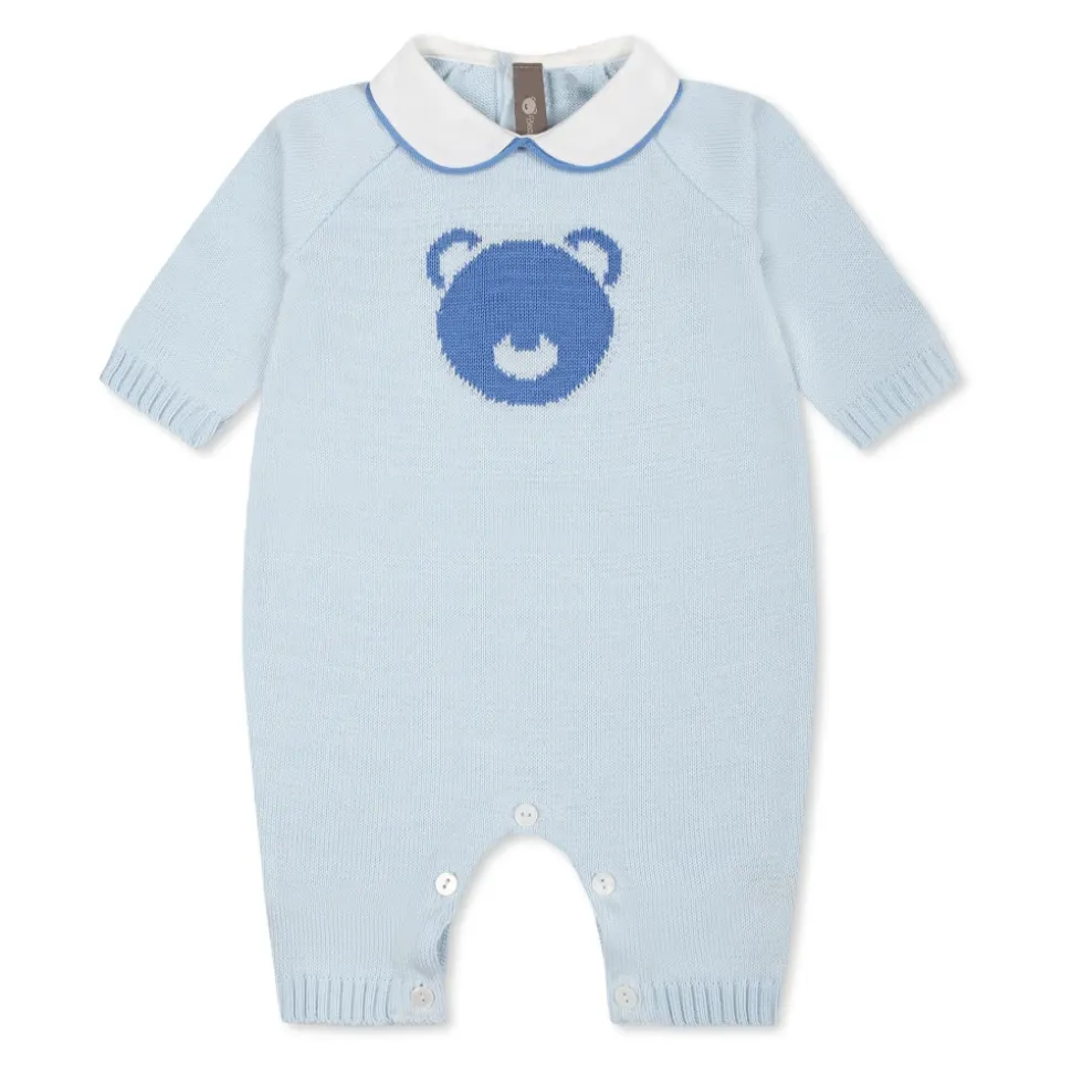 Kleed je kleintje in stijl met deze lichtblauwe katoenen romper van Little Bear. Met lange mouwen, een witte peter pan-kraag, parelmoer knopen, geribbelde manchetten en enkels, en een schattige blauwe beer op de voorkant. Gemaakt in Italië. 100% katoen. Alleen handwas.