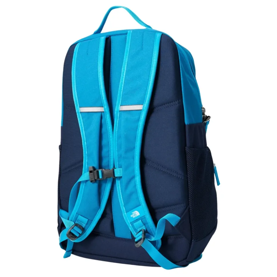 De North Face Kids rugzak in turquoise/blauw, met FlexVent-suspensiesysteemontwerp, gewatteerde sleutelgebieden voor maximaal comfort tijdens transport, inclusief een laptopsleeve, grote voorste ritssluiting voor veilige opslag van apparaten, snacks of schoolbenodigdheden, twee externe waterflessen zakken met elastiek voor een veilige pasvorm, verstelbare borstband voor gewichtsverdeling, afgewerkt met reflecterende details voor verbeterde veiligheid bij weinig zichtbaarheid, borstband met veiligheid fluitgesp. Stof: 600D Polyester / 1200D Polyester.