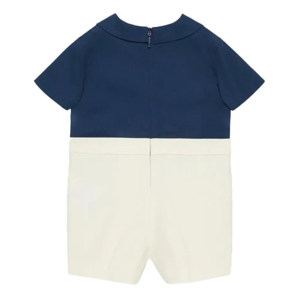 Kleed je kleintje in stijl met deze Gucci baby stretch katoen poplin jumpsuit. Gemaakt van comfortabel stretch katoen, deze donkerblauwe en witte jumpsuit heeft een rood en blauw gevlochten streep als afwerking voor een vleugje kleur. Belangrijkste kenmerken: Blauw | Multicolor | Stretch Katoen Poplin | Knoop- en ritssluiting | Open kraag | Korte mouwen | Interlocking G borduursel | Samenstelling en onderhoud: 100% Katoen | Machinewas koud, droogtrommel laag.
