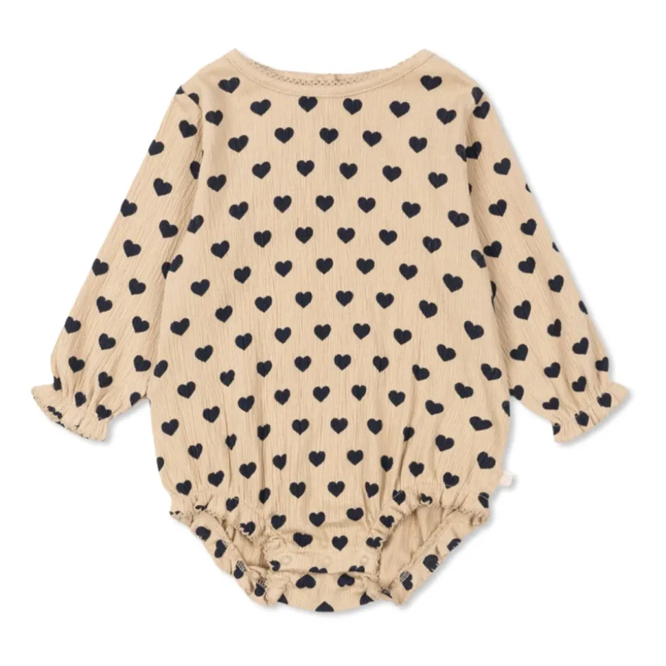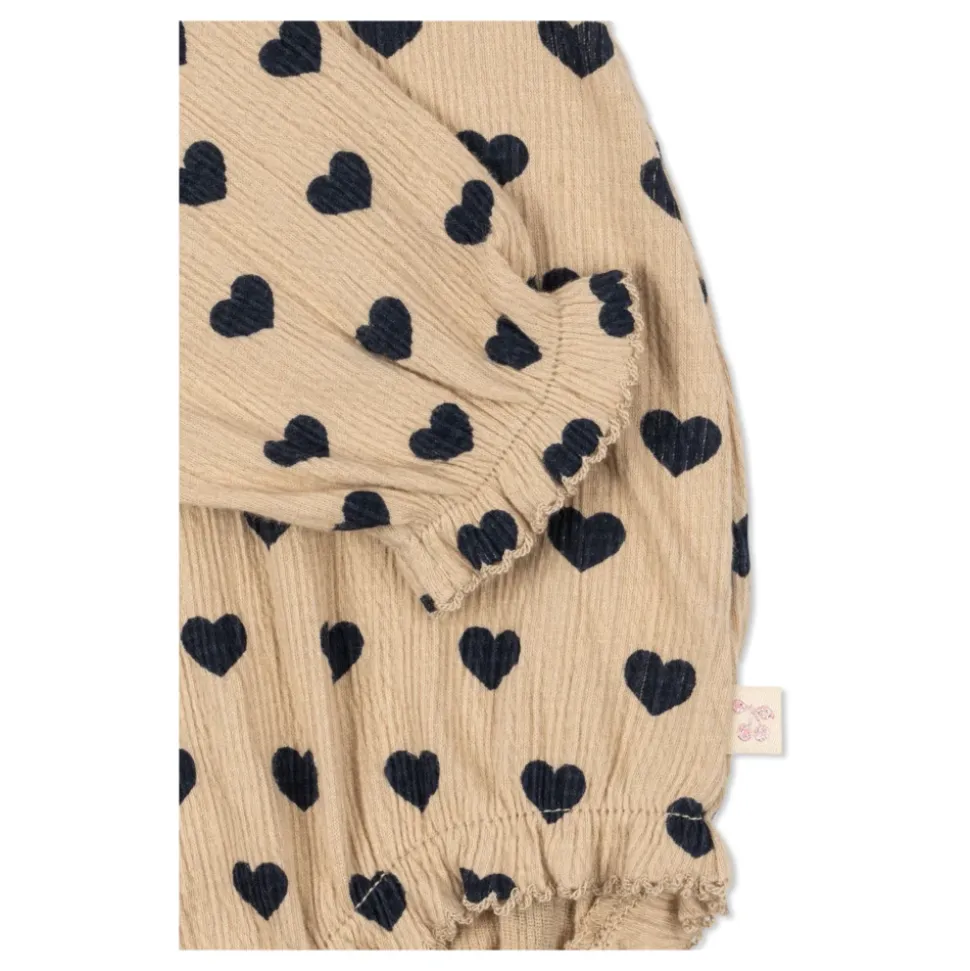 GEPATRONEERDE BODYSUIT van Konges Sløjd is het toonbeeld van verfijnde eenvoud en comfort, ontworpen met de jongsten in gedachten. Een subtiele beige tint, versterkt door een regelmatig motief van donker marineblauwe harten, geeft het stuk uitzonderlijke charme, terwijl de ruime, licht opgeblazen silhouet zorgt voor bewegingsvrijheid elke dag. Elegant geribbeld breisel is zacht, ademend en zacht voor de gevoelige huid van een baby. Een delicate afwerking met een kanten accent rond de halslijn en prachtige gerimpelde plooien afgewerkt met ruches bij de mouwen en beenopeningen voegen een duidelijk exclusief karakter toe aan de bodysuit. De productie is gebaseerd op premium katoenvezels met een GOTS-certificaat, waarbij de nadruk ligt op milieuzorg. Opmerkelijke afwerkingsprecisie en originele stijl onderscheiden elk ontwerp van het Deense merk. WAAROM DIT PRODUCT KIEZEN? * Uitzonderlijke kwaliteit die het comfort van uw kind waarborgt * Uniek, tijdloos patroon en exclusieve details * Huidvriendelijk en milieubewust materiaal * Functionele, comfortabele snit met prachtige afwerking