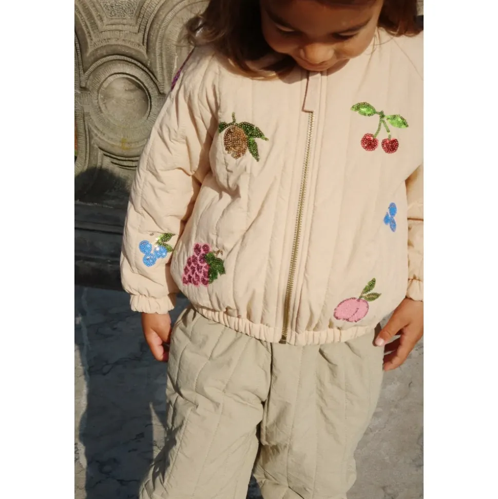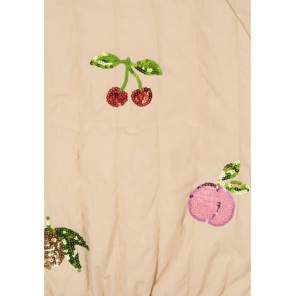 DE BOMBERJACK van Konges Sløjd is een perfecte fusie van onconventionele elegantie en boeiend gemak. Het ontwerp heeft een moderne, verkorte silhouet en een lichtheid benadrukt door elastische ribbels aan de manchetten en zoom. De delicate glans van de fluweel-gequilt stof verbetert het exclusieve gevoel, terwijl de klassieke, ronde halslijn het algehele uiterlijk harmonieus afrondt. De uitzonderlijke originaliteit van de jas wordt benadrukt door meesterlijk vervaardigde kleurrijke paillettenapplicaties: patches en borduursels die sappig fruit afbeelden – kersen, druiven, perziken en bessen – en zo een charmante, artistieke accent creëren. De praktische ritssluiting voegt moeiteloos gebruiksgemak toe, terwijl de subtiele afwerking de visuele aantrekkingskracht van dit unieke stuk verhoogt. WAAROM IS DIT PRODUCT HET KOPEN WAARD? * Onconventioneel ontwerp met verfijnde details * Licht gequilt, zachte structuur zorgt voor comfort en een onberispelijke uitstraling * filosofie van het merk Konges Sløjd * Luxueuze afwerking zonder zichtbare logo’s – het draait allemaal om de details * Unieke kleurrijke paillettenapplicaties creëren een onnavolgbaar effect