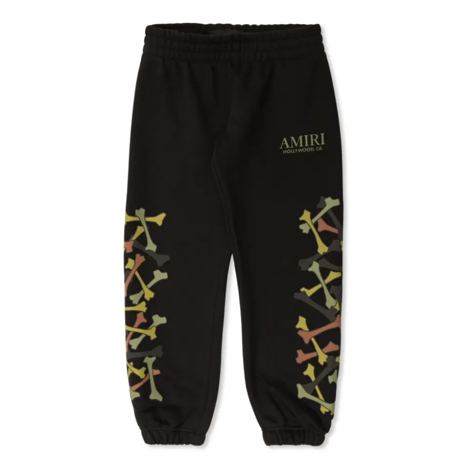 De Amiri Bones Sweatpant combineert de kenmerkende grafische details van het label met een stevige katoenen constructie voor comfortabel dagelijks gebruik. De opvallende zijmotieven en merkaccenten geven het een onderscheidende designerlook. Belangrijkste kenmerken: Zwart | Katoen | Comfortabel | | Elastische tailleband | Elastische manchetten | Gestileerde veelkleurige kruisachtige motieven aan de zijkanten | Lichtgroen designerlogo en “HOLLYWOOD, CA” embleem aan de voorkant | Zwarte patch met wit “AM” logo op de achterste tailleband | Taps toelopende pijpen | Afmetingen & pasvorm: Taille (maat 8Y): 33 cm | Kruishoogte (maat 8Y): 21,6 cm | Heup (maat 8Y): 43,2 cm | Binnenbeenlengte (maat 8Y): 58,4 cm | Relaxte pasvorm | Jogger silhouet met taps toelopende pijpen en elastische manchetten | Samenstelling & verzorging: 100% katoen | Het kledingstuk heeft een speciale afwerking ondergaan die de kleurschakering kan beïnvloeden en kleur kan afgeven; wees voorzichtig bij het wassen of chemisch reinigen en was apart.