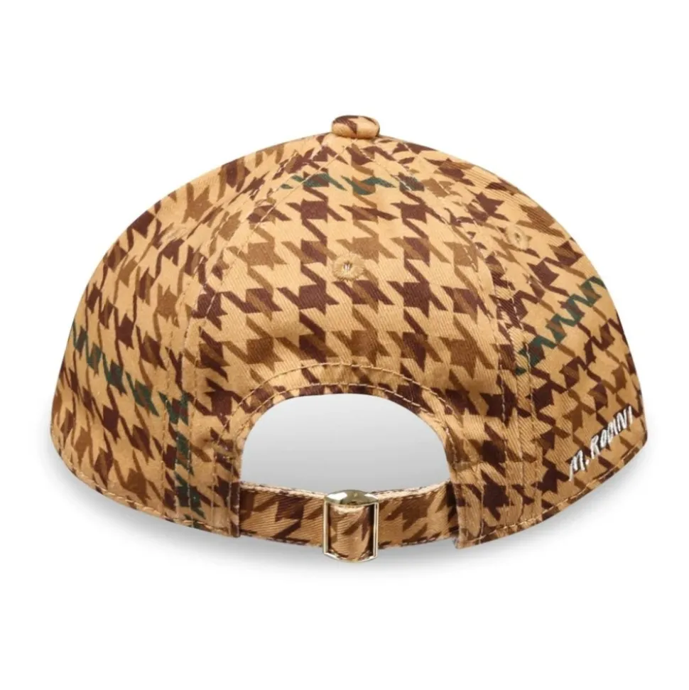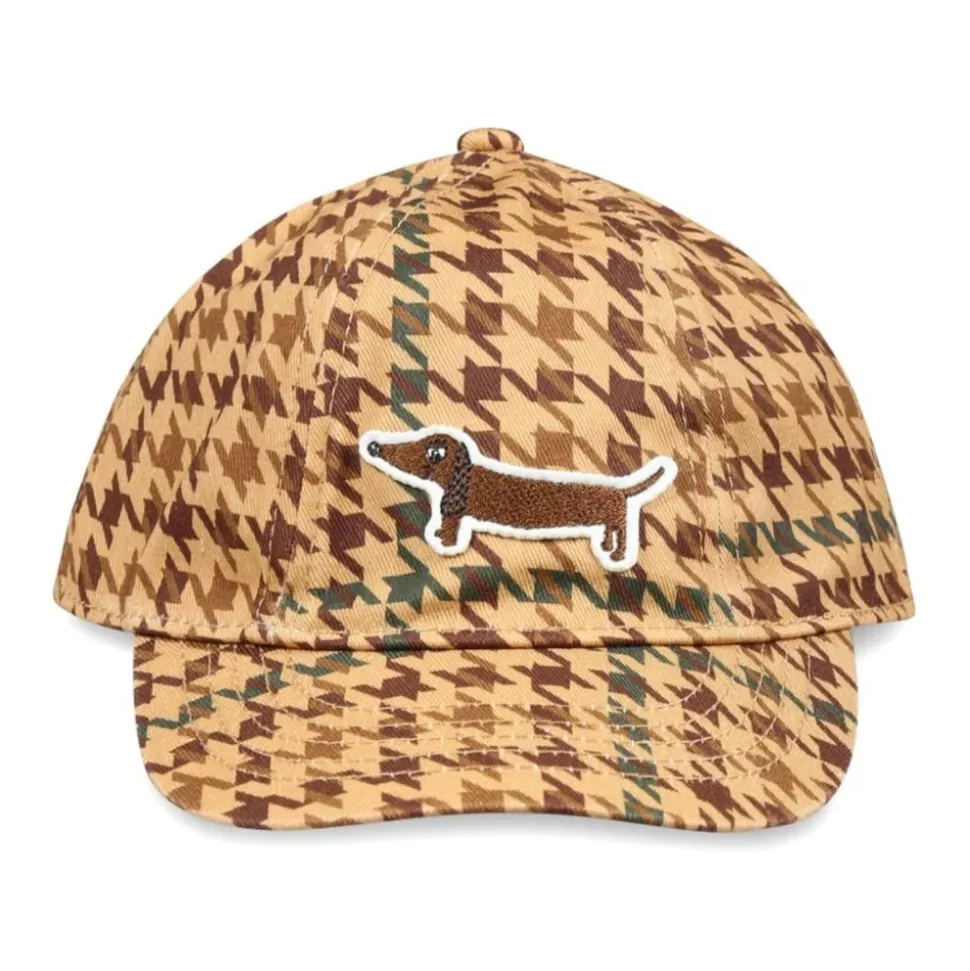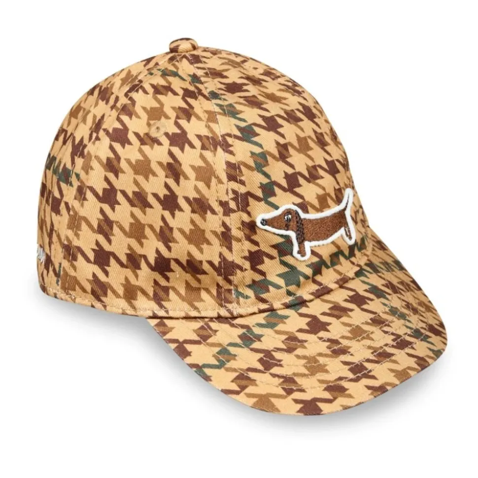 Lichtbruine hondenapplicatiepet van Mini Rodini. Gemaakt van katoenen keperstof met verstelbare band, pied-de-poule print, stofbedekte knoop, ronde kroon, applicatiedetail, geborduurd logo en gebogen klep.