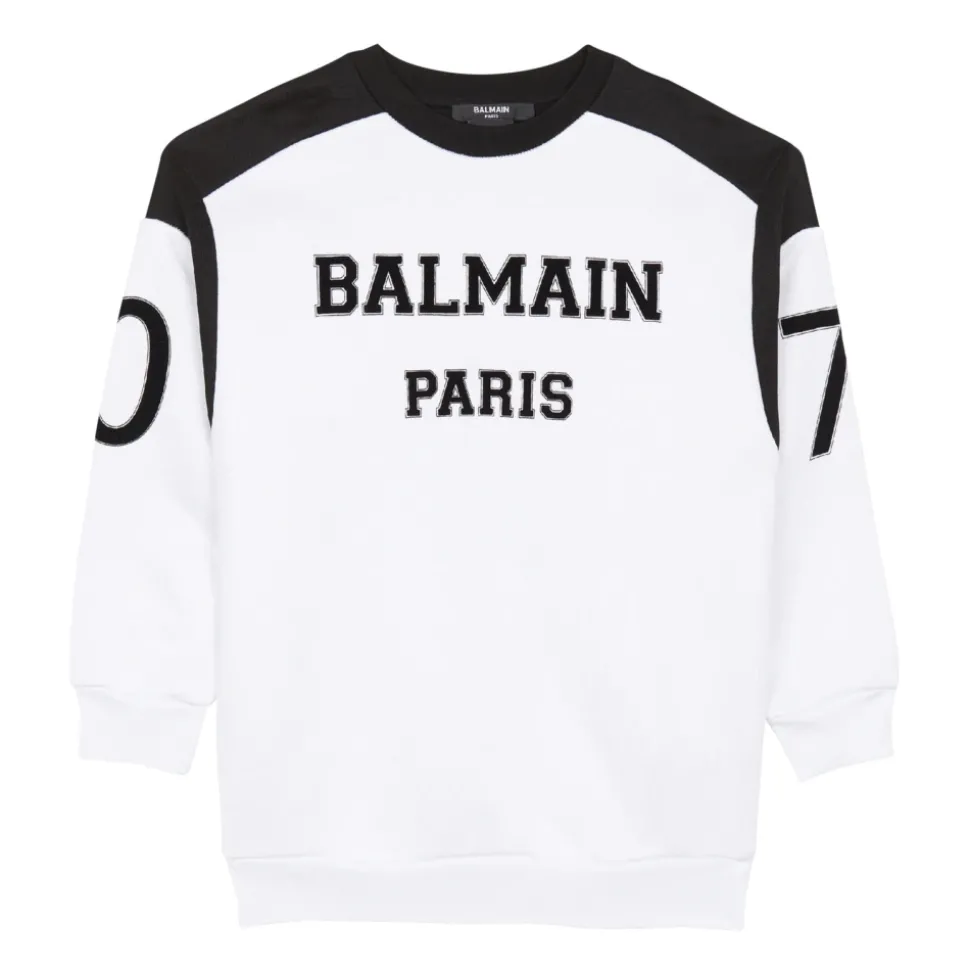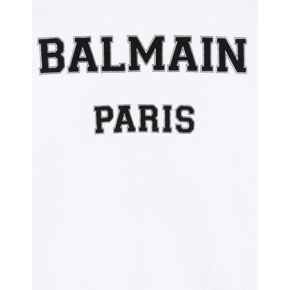 De BT4R90Z1207 Sweatshirt van Balmain is een tweekleurig, dik katoenen jersey item met contrasterende schouder- en elleboogpanelen en een opvallende Balmain Paris print. De ronde hals en geribbelde boorden maken het een comfortabele, statement-waardige laag. Belangrijkste kenmerken: Wit | Katoen en rayon | Geribbelde boorden | Tweekleurig met contrasterende schouder- en elleboogpanelen | Ronde hals | Lange mouwen | Balmain Paris print op de voorkant | Geribbelde boorden | Samenstelling & verzorging: 50% katoen | 50% rayon