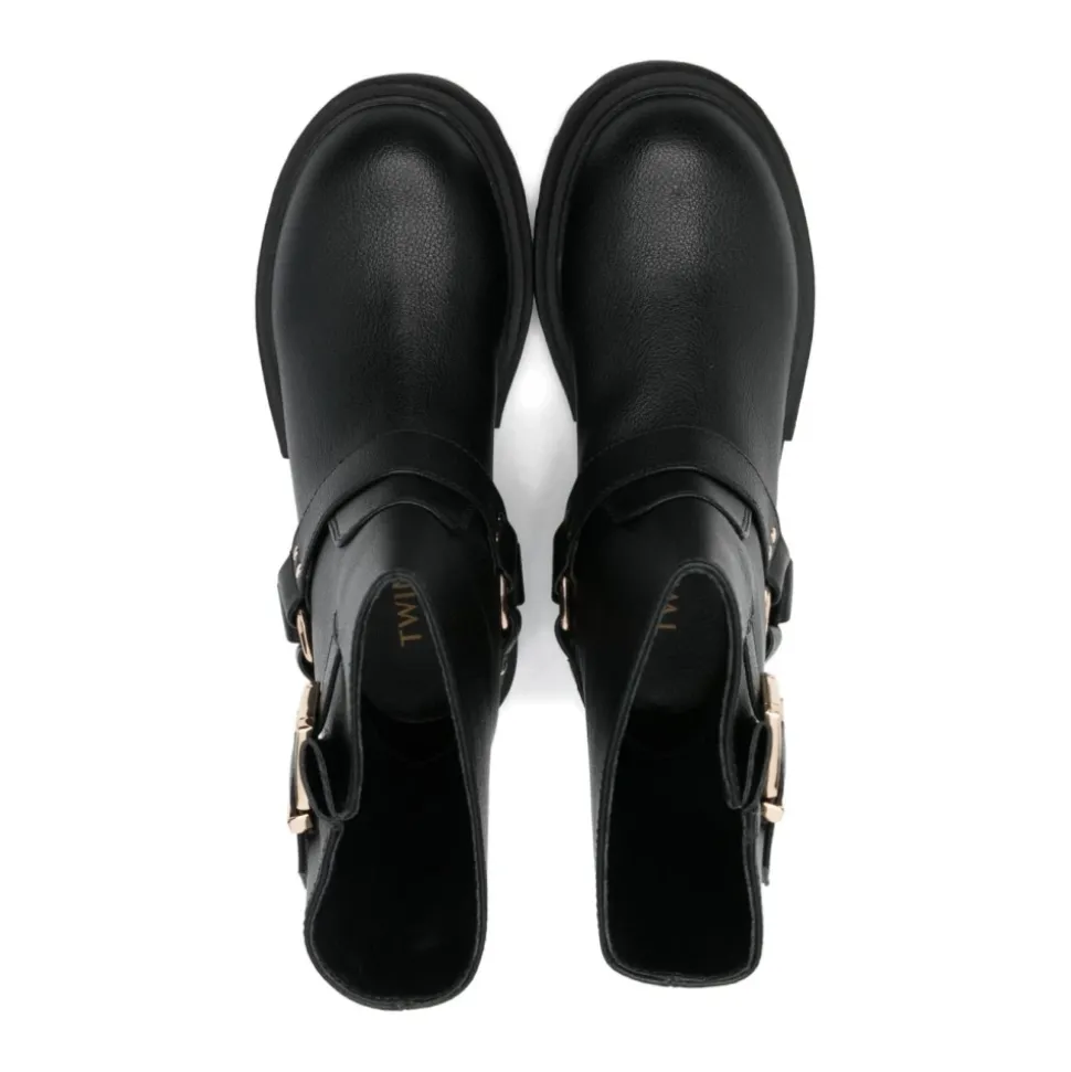 De Twinset Buckle Boots combineren een stoere plateauzool met een stevige gespsluiting voor een gemakkelijke, opvallende alledaagse laars. Belangrijkste kenmerken: Zwart | Polyurethaan | Gespsluiting | Plateauzool | Rubberen zool | Ronde neus | Gesp detail | Samenstelling & onderhoud: Buitenkant: 100% polyurethaan | Zool: 100% rubber | Voering: 100% polyurethaan