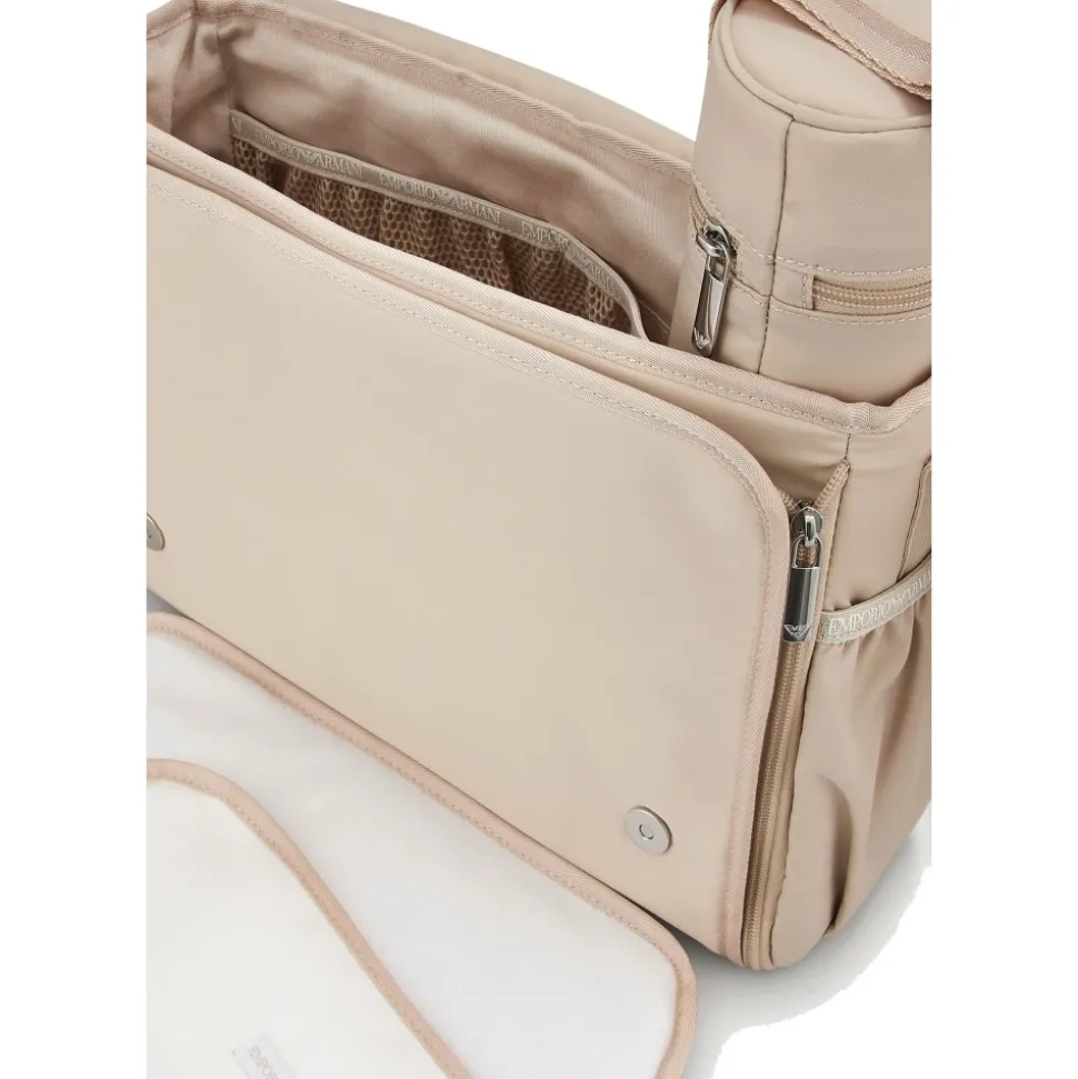 De Armani Changing Bag Set combineert een lichtgewicht, polyamide constructie met praktische opbergruimte voor verschonen onderweg en het opbergen van flessen. De set is gericht op eenvoudige organisatie en een strakke, verfijnde look. Belangrijkste kenmerken: Beige | Polyamide | Lichtgewicht | stof | Zacht gevoel | Verstelbare schouderriem | Flap sluiting | Inclusief zacht verschoningsmatje | Flessenhouder met ritssluiting | Georganiseerde vakken voor eenvoudig opbergen | Strak, minimalistisch silhouet | Tijdloos elegant design | Iconische adelaar plaque detail | Samenstelling & verzorging: 100% polyamide | Volg de wasinstructies op het waslabel aan de binnenkant van het product.
