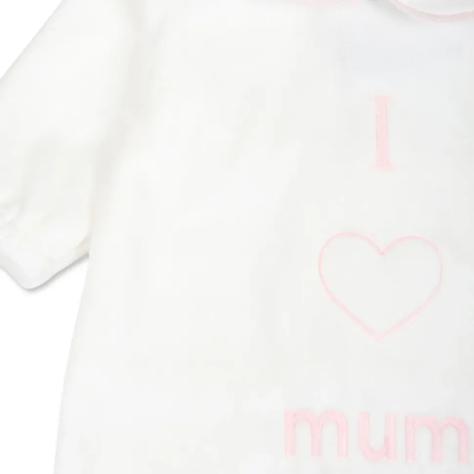 Kleed je kleintje in stijl met deze witte chenille boxpak van Little Bear. Met lange mouwen, een peter pan kraag met roze details, drukknoopsluiting op de rug en elastische voeten en manchetten. Versierd met een hart en ‘Mum’ borduursel op de voorkant. Gemaakt in Italië van 80% katoen en 20% polyamide. Alleen handwas.