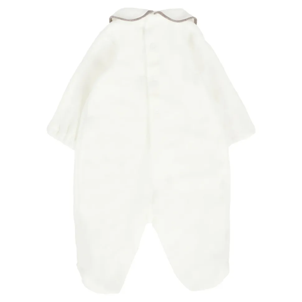 Kleed je kleintje in stijl met deze ivoorkleurige chenille jumpsuit van Little Bear. Met lange mouwen, een Peter Pan-kraag met bruine afwerking, drukknopen aan de achterkant en tussen de benen, elastische manchetten en voetjes. Versierd met de woorden ‘Ik hou van mama’ geborduurd op de voorkant. Gemaakt in Italië. Materiaal: 80% katoen, 20% polyamide. Alleen handwas.