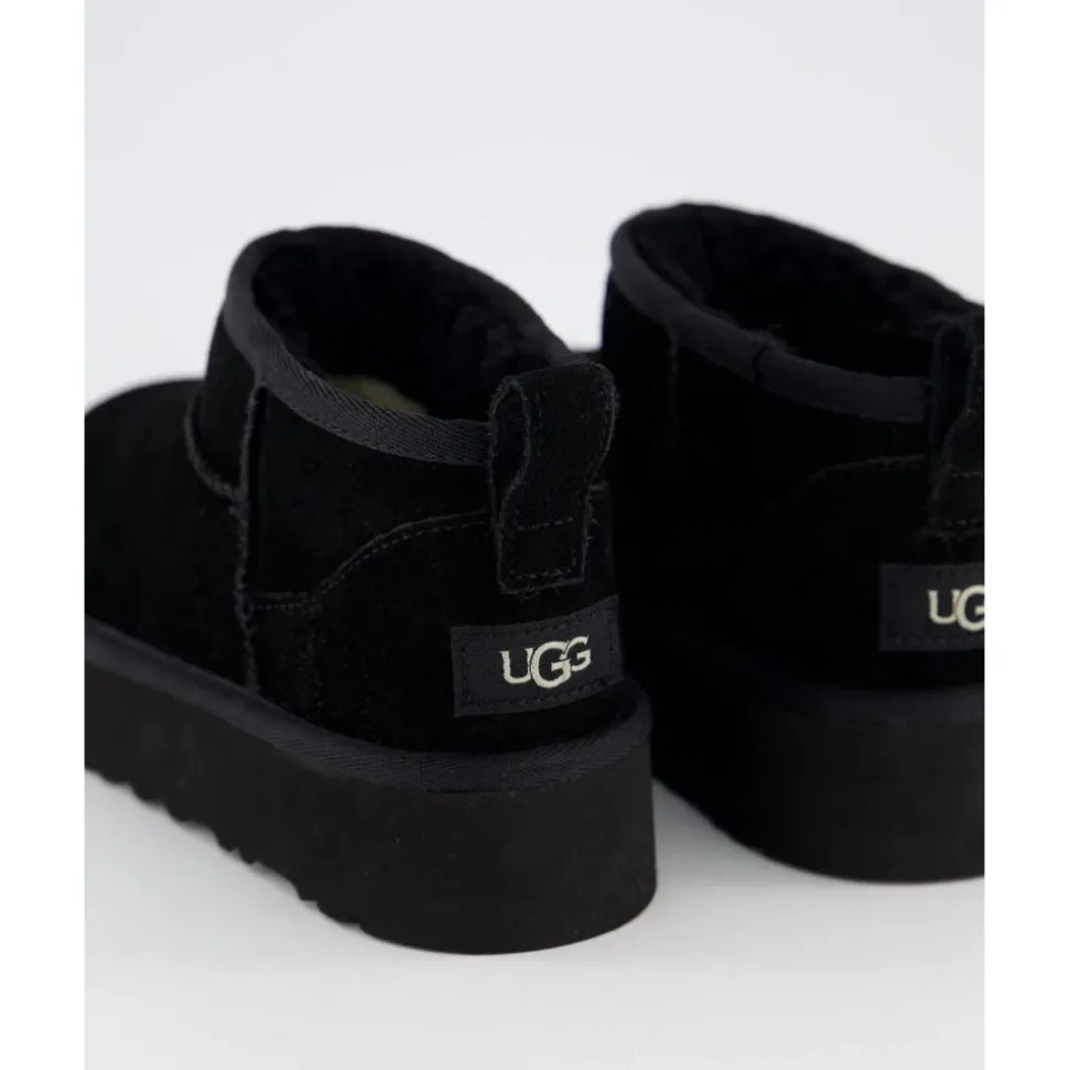 De UGG Classic Ultra Mini Platform combineert een compacte platformzool met een zachte UGGplush-voering voor comfortabel, dagelijks gebruik. Het ontwerp biedt een balans tussen een zacht, gedempt gevoel en gemakkelijk aan- en uittrekken. Belangrijkste kenmerken: Black | Zwart | Suède | Lichtgewicht EVA platformzool | Gewatteerde binnenzool | Zachte UGGplush-voering | Treklus aan de achterkant voor gemakkelijk aan- en uittrekken | Schuim voetbed | Asymmetrische bovenrand | Overlock stikseldetails | Kenmerkende dubbele naden | Platformprofiel | Afmetingen en pasvorm: Valt normaal qua maat – bestel je gebruikelijke maat. | Samenstelling en onderhoud: Bovenkant: Suède | Voering: 17 mm UGGplush (60% wol, 40% TENCEL Lyocell) | Binnenzool: 17 mm UGGplush (60% wol, 40% TENCEL Lyocell) | Tussenzool: EVA | Buitenzool: Suikerriet EVA | Voetbed: Schuim