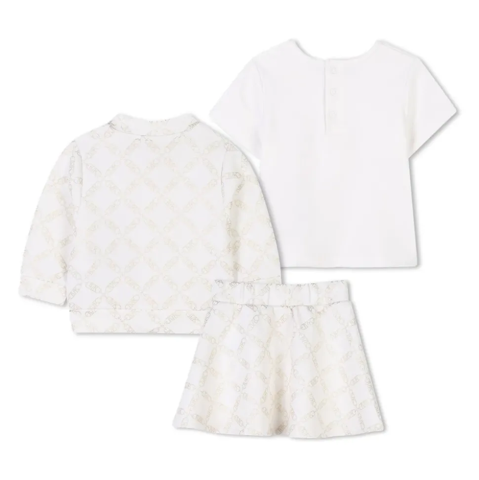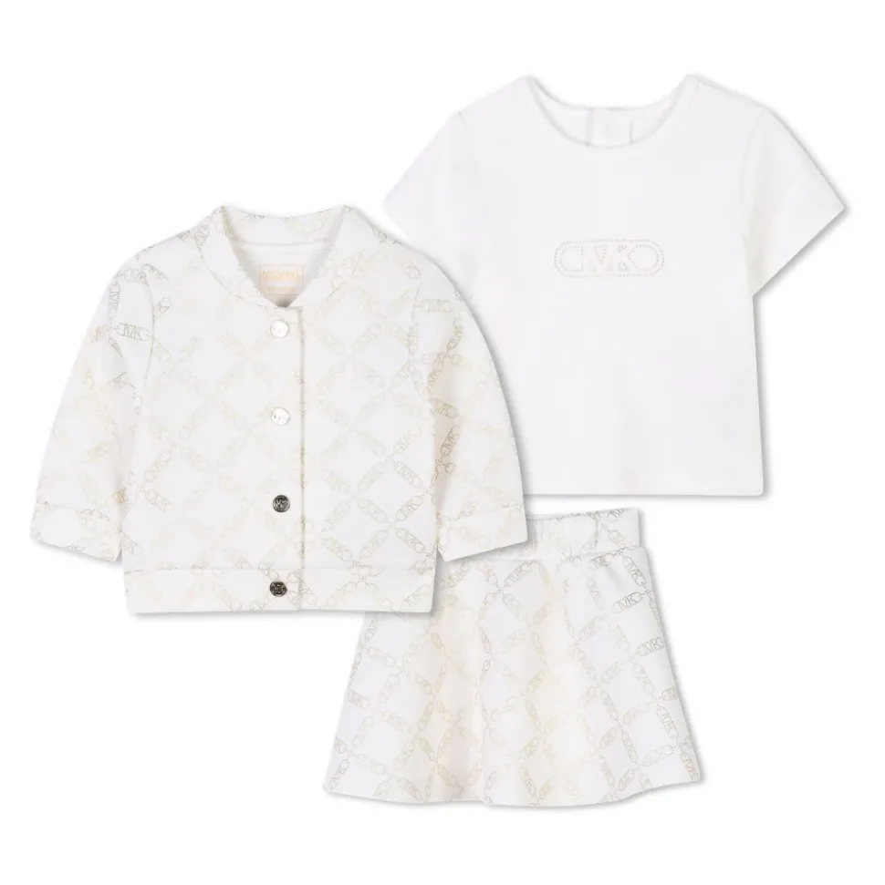 Michael Kors Completo Sportivo is een gecoördineerde driedelige set—vest, rok en T-shirt—geaccentueerd door een metallic Empire-logo en een zachte double-jersey constructie voor een verzorgde alledaagse look. Belangrijkste kenmerken: Beige | Polyester mix | Stretch | Zacht aanvoelend | Drukknoopsluiting op vest | Elastische tailleband op rok | Drukknoopsluiting achteraan op T-shirt voor gemakkelijk aankleden | Metallic Empire-logo | Gecoördineerde driedelige set (vest, rok, T-shirt) | Logo met metallic effect op T-shirt | Afmetingen & pasvorm: Elastische tailleband voor verstelbare pasvorm | Drukknoopsluitingen voor gemakkelijk aankleden | Samenstelling & onderhoud: 64% polyester, 29% viscose, 7% elastaan | 100% katoen (T-shirt en afwerking) | Machinewas koud. Niet chemisch reinigen. Niet bleken. Niet in de droogtrommel. Strijken op max. 110°C zonder stoom. Gebruik een mild, niet-blekend wasmiddel.