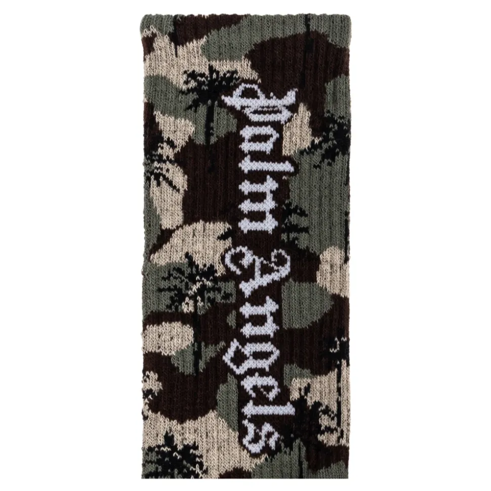 De Palm Angels Cotton Camouflage Motif Sokken combineren een gedempt camouflagepatroon met contrasterende palm motieven en een Gothic logo voor een onderscheidende look. Ribgebreide katoenen constructie en versterkte teen- en hielzones zorgen voor comfortabel en draagcomfort. Belangrijkste kenmerken: Groen | Ribgebreid katoen | Zacht gevoel | Ademende stof | constructie | Versterkte teen en hiel | Geribde been voor een stevige pasvorm | Aantrekmodel | Camouflage motief in gedempt groen, beige en zwart | Contrasterende zwarte palm motieven | Witte Gothic ‘Palm Angels’ inscriptie op de kuit | Geribde textuur | Afmetingen en pasvorm: Klassieke snit — komt boven de enkel | Samenstelling en onderhoud: Katoen