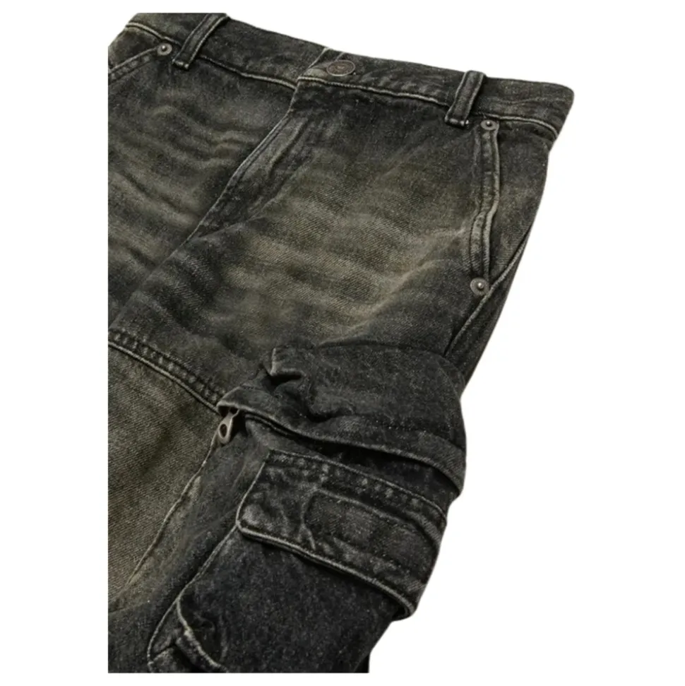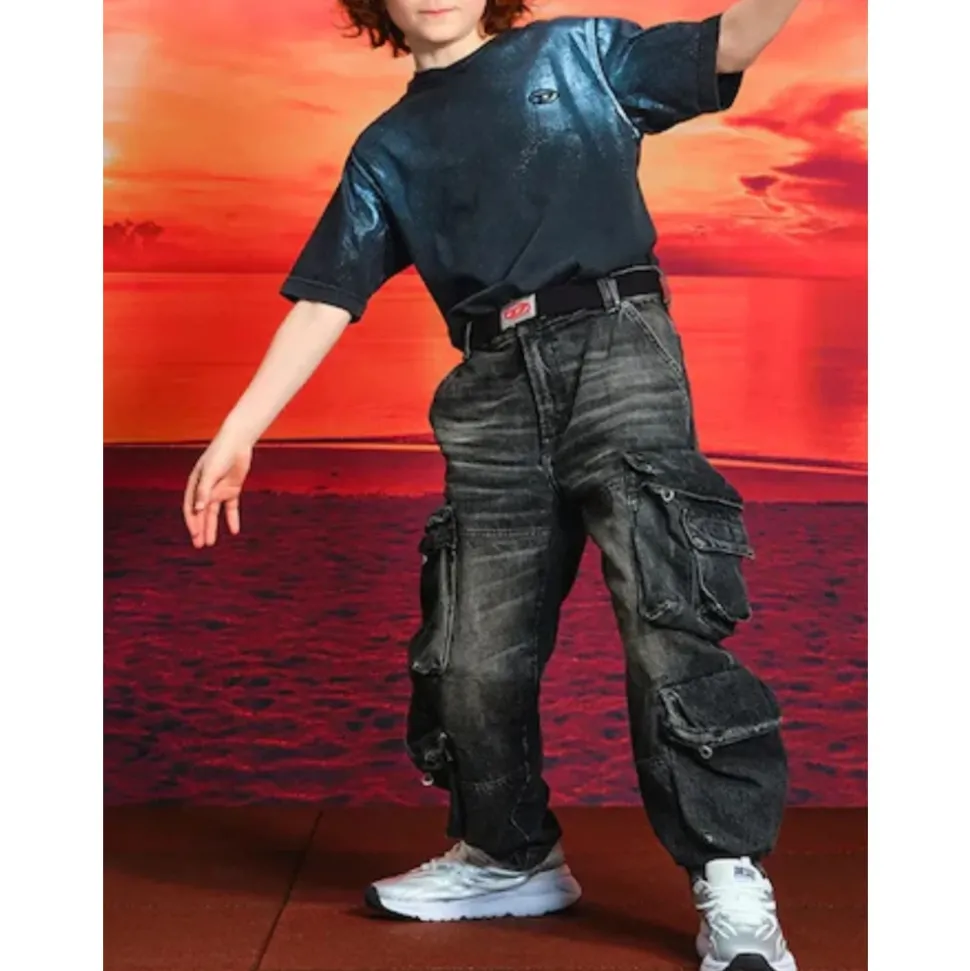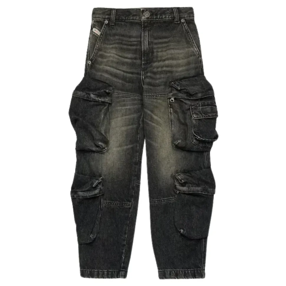Diesel jeans in een zwarte wassing, afgewerkt met decoratieve vervaging en cargo-geïnspireerde details voor een relaxte, alledaagse look. Belangrijkste kenmerken: Zwart | Katoen | Lichte stretch | Cargozakken aan de zijkant | Steekzakken | Knoop- en ritssluiting | Decoratief vervaagde afwerking | Zwarte wassing | Afmetingen & pasvorm: Losse pasvorm | Normale taille | Samenstelling & verzorging: 80% katoen | 20% hennep