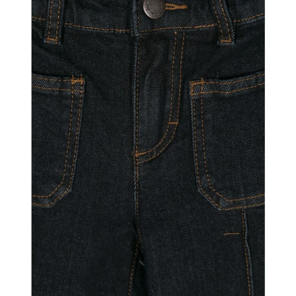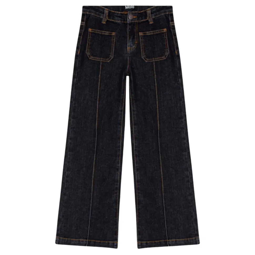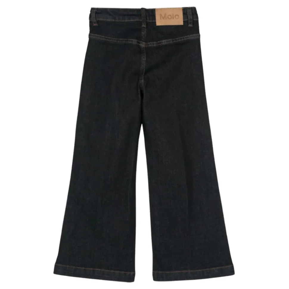 Molo Kids jeans in donkerblauwe wassing, bootcut pasvorm met geplooide details, logo patch op de achterkant, gelaste naden, verborgen ritssluiting en knoopsluiting, middelhoge taille, riemlussen en voorzak. Gemaakt van 67% katoen, 32% polyester, 1% elastaan.