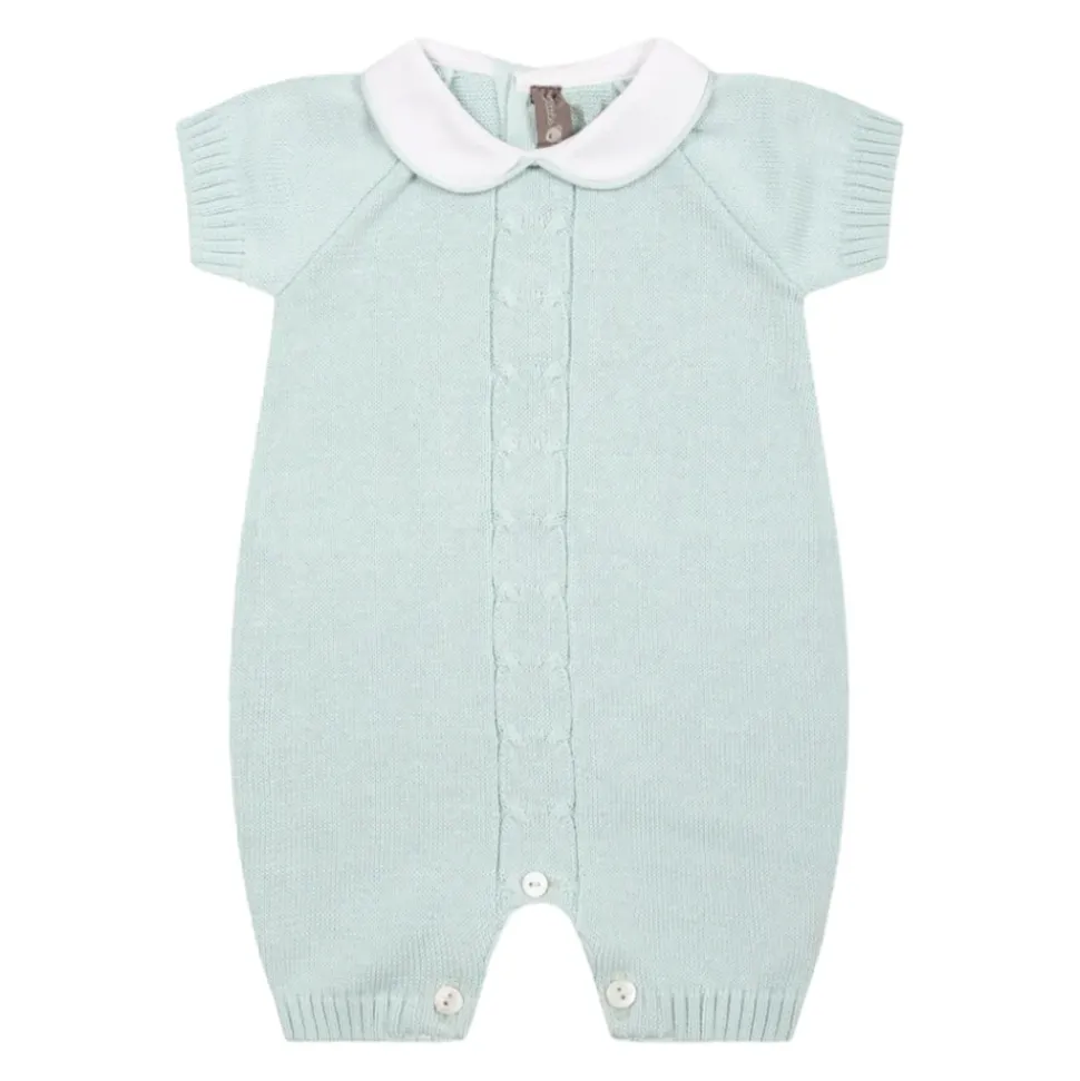 Kleed je kleintje in stijl met deze groene katoenen romper van Little Bear. Met een witte kraag met groene afwerking, korte mouwen, witte knoopsluiting op de achterkant en tussen de benen. Versierd met vlechtdetails aan de voorkant.