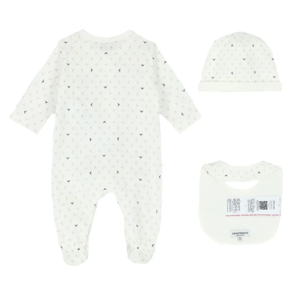 De Armani Eagle Optical Onesie Geschenkset combineert een kenmerkende all-over adelaarprint met een driedelige katoenen set. Het is ontworpen voor gemakkelijk aankleden en lichtgewicht dragen in warmere maanden. Belangrijkste kenmerken: Wit | Bianco | Katoen | Lichtgewicht | Geschikt voor warm weer | Driedelige set: onesie, slabbetje en muts | Drukknoopsluitingen voor gemakkelijk aankleden | Drukknoopsluitingen bij het kruis voor snelle verschoningen | All-over op-art adelaarprint | Logo drukknoopdetails | Samenstelling & onderhoud: 100% Katoen | Machinewas 30°C; niet strijken; niet wassen met lichte kleuren; geen bleekmiddel gebruiken.