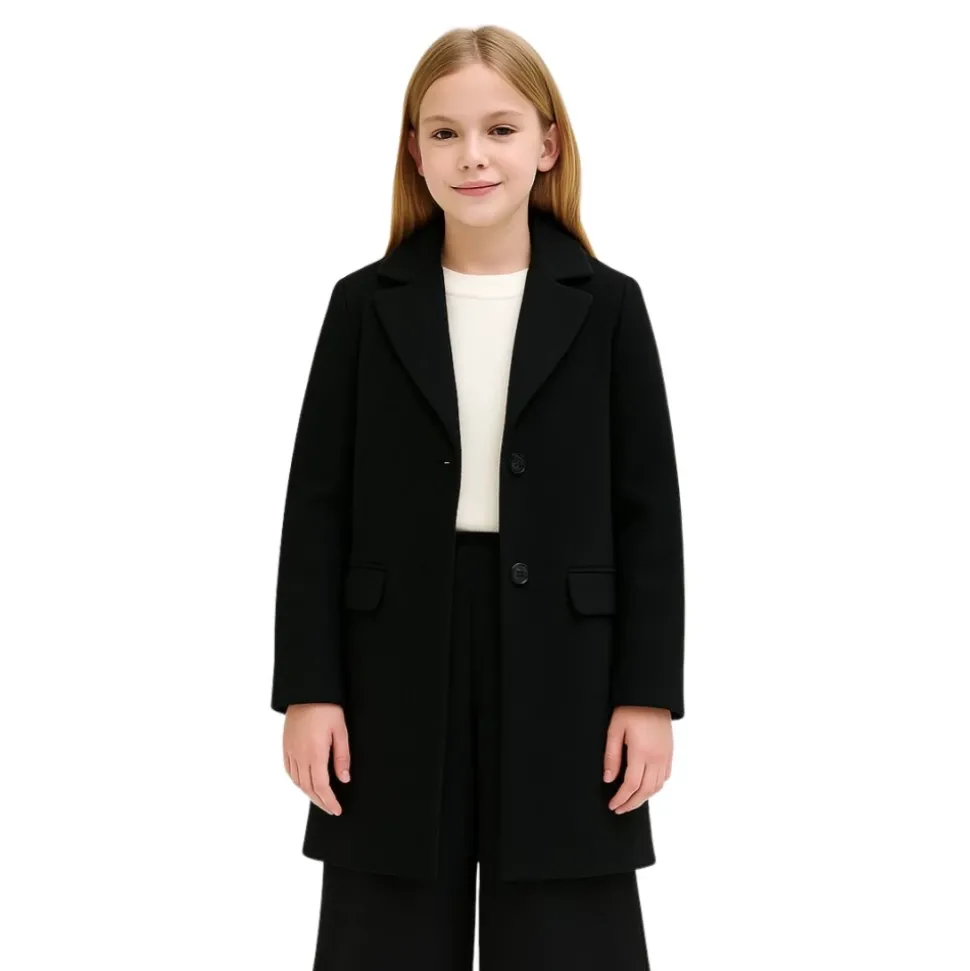 De Kocca Nathalie zwarte korte jas voor meisjes is een must-have voor het winterseizoen. Elegant en veelzijdig, het maakt elke outfit compleet met een verfijnde touch, perfect voor zowel school als speciale gelegenheden. De rechte lijn en reguliere pasvorm maken het comfortabel en altijd stijlvol. Gemaakt van 100% polyester met stretch voering, zorgt het voor warmte en praktisch gebruik zonder in te leveren op stijl. Op maat gemaakte details zoals de klassieke revers, knoopsluiting en klepzakken geven het een verfijnde en moderne uitstraling. Een elegante jas die niet mag ontbreken in de wintergarderobe van meisjes, gemakkelijk te combineren met jurken, rokken en broeken. Samenstelling: 100% polyester. Voering: 95% polyester, 5% elastaan. Verzorging: machinewas op 30°. Lengte: knielengte.