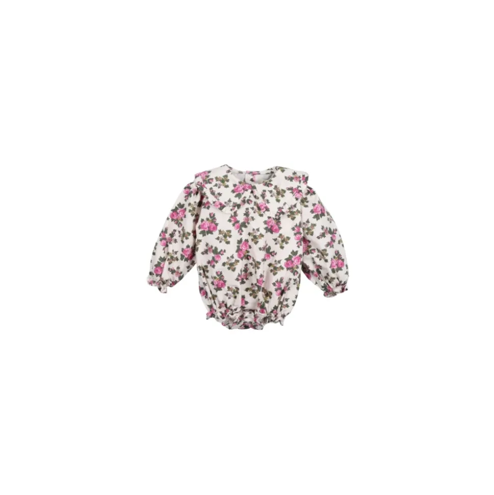 Zachte en gezellige babyromper gemaakt van premium flanel katoen, met lange mouwen en een delicaat bloemenpatroon. Ontworpen met een charmante bijpassende stoffen kraag, het opent aan de achterkant en onderkant met toon-op-toon drukknopen voor gemakkelijk aan- en uitkleden. Gemaakt in Portugal 100% katoen