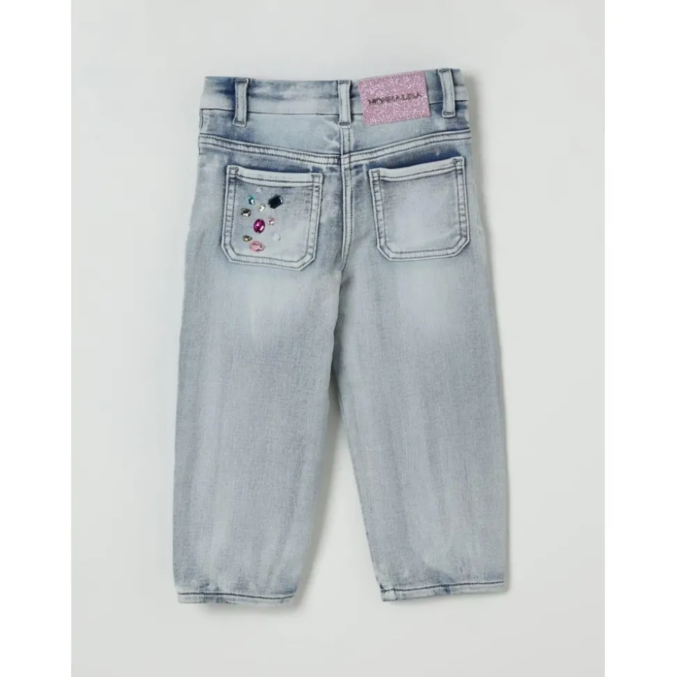 De Monnalisa Embellished Denim Jeans brengen sprankelende versieringen naar klassiek denim, waardoor alledaagse casual looks worden verfraaid met een vleugje glamour. Belangrijkste kenmerken: Grijs | Grijze | Unieke versieringen | Denim constructie | Casual styling